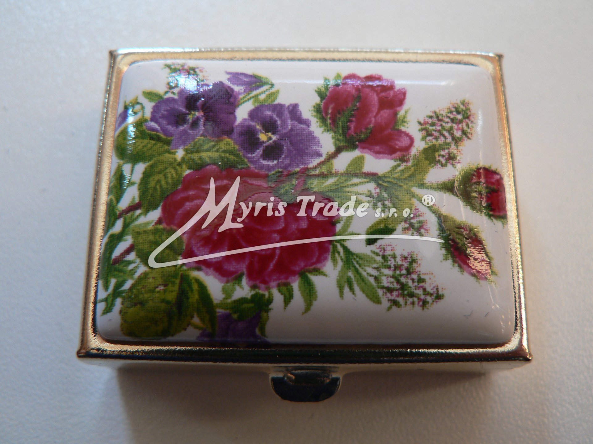 klasická obdélníková lékovka je vyrobena z kovu zlaté barvy s porcelánovým víčkem s květinovým motivem