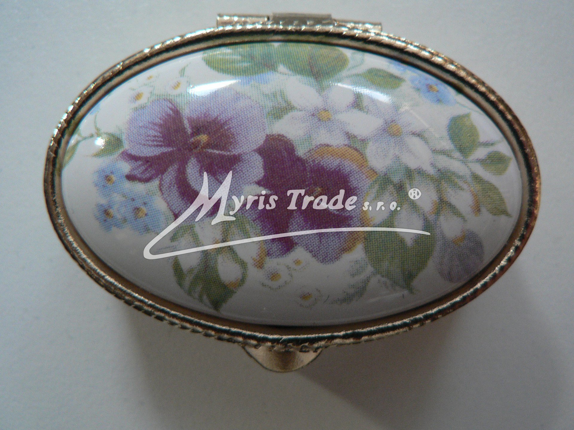 klasická oválná lékovka je vyrobena z kovu zlaté barvy s porcelánovým víčkem s květinovým motivem