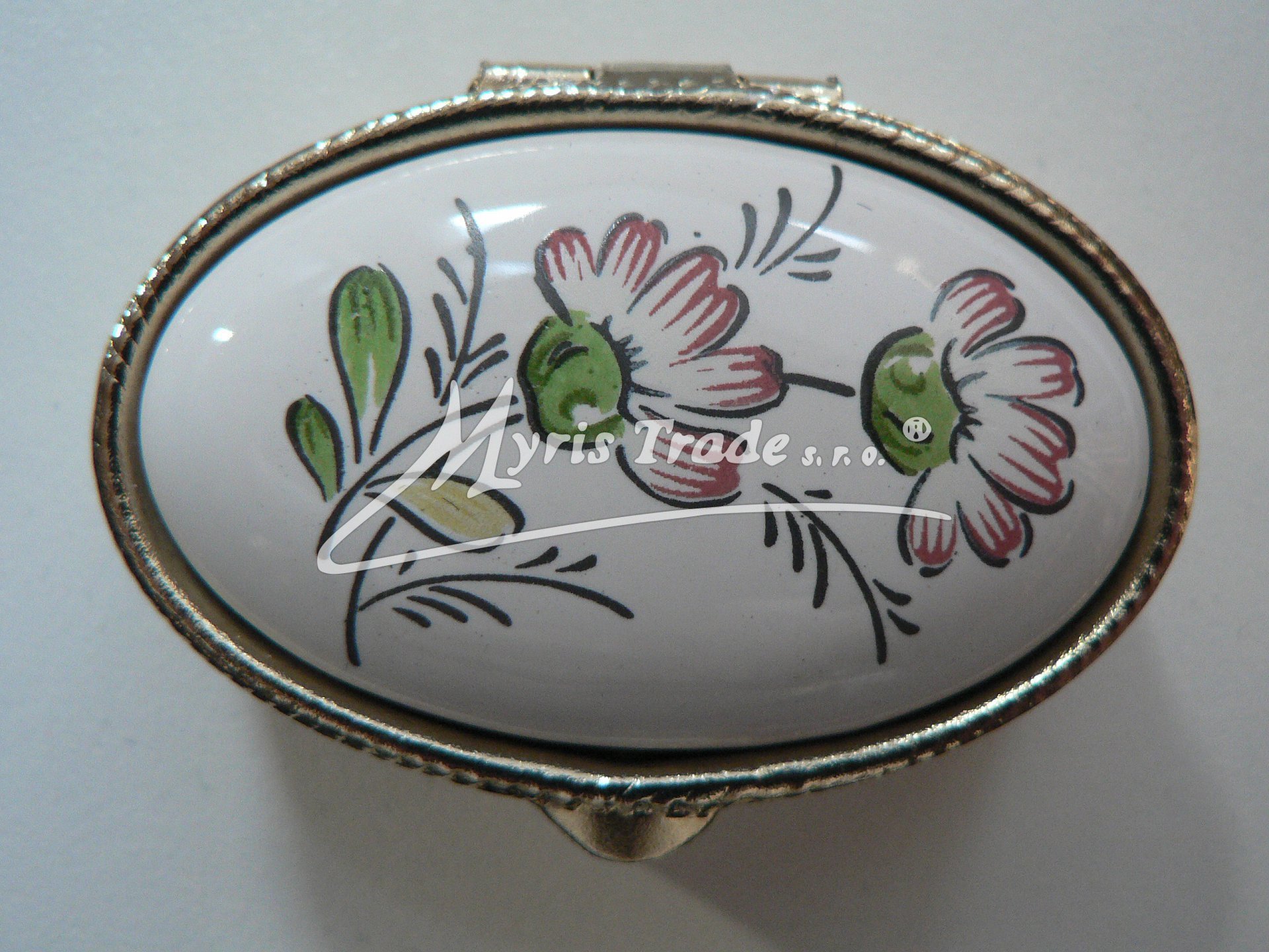 klasická oválná lékovka je vyrobena z kovu zlaté barvy s porcelánovým víčkem s květinovým motivem