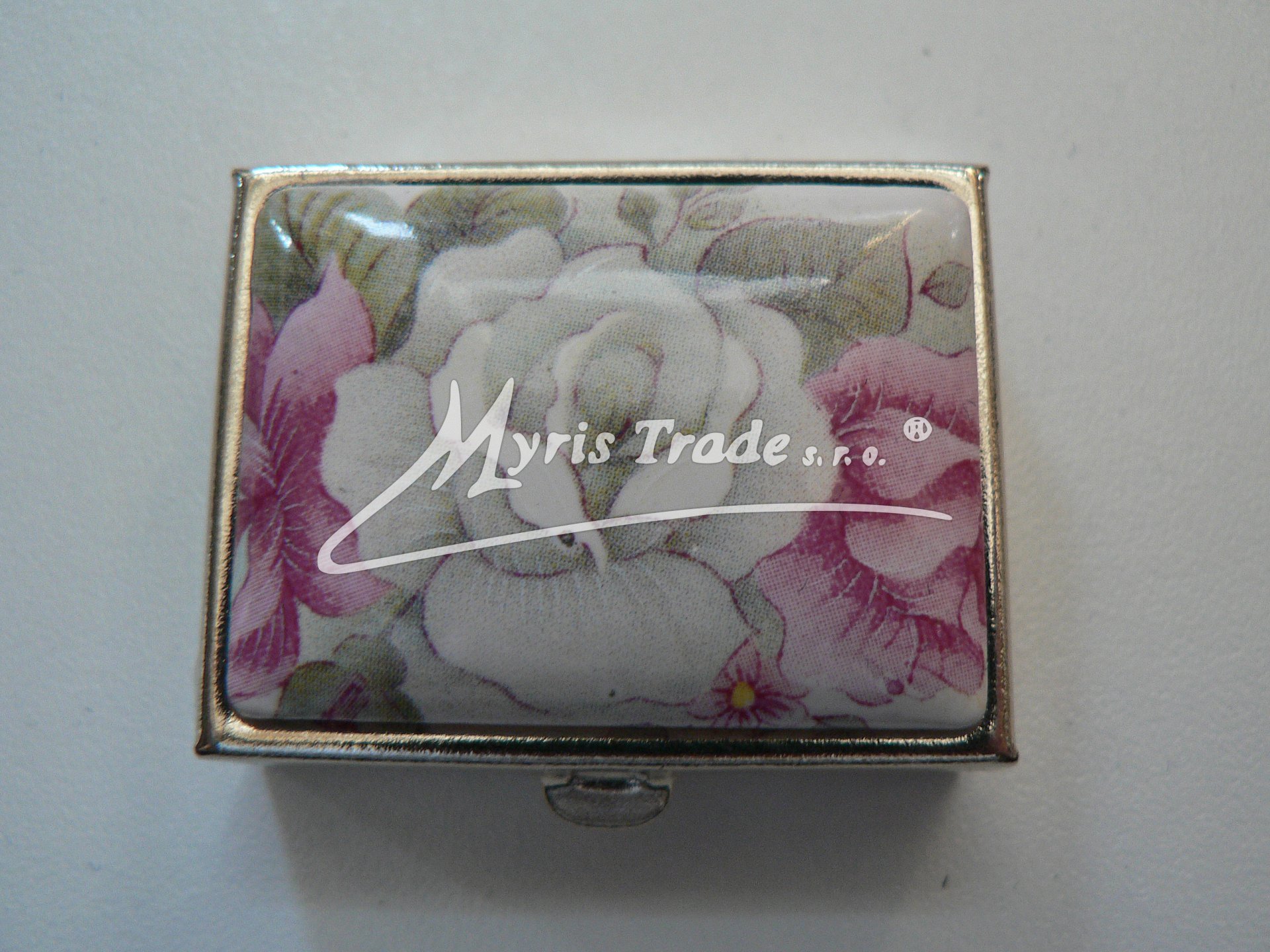 klasická obdélníková lékovka je vyrobena z kovu zlaté barvy s porcelánovým víčkem s květinovým motivem