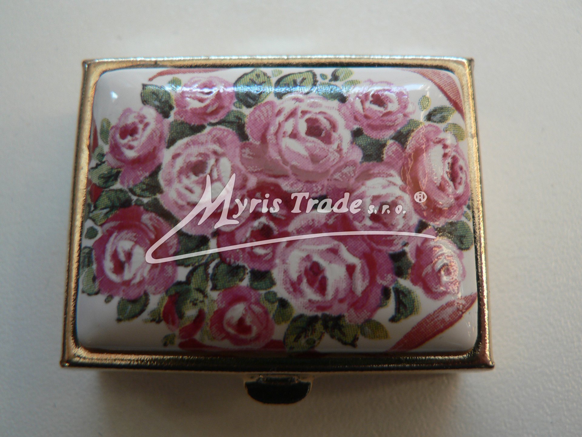 klasická obdélníková lékovka je vyrobena z kovu zlaté barvy s porcelánovým víčkem s květinovým motivem