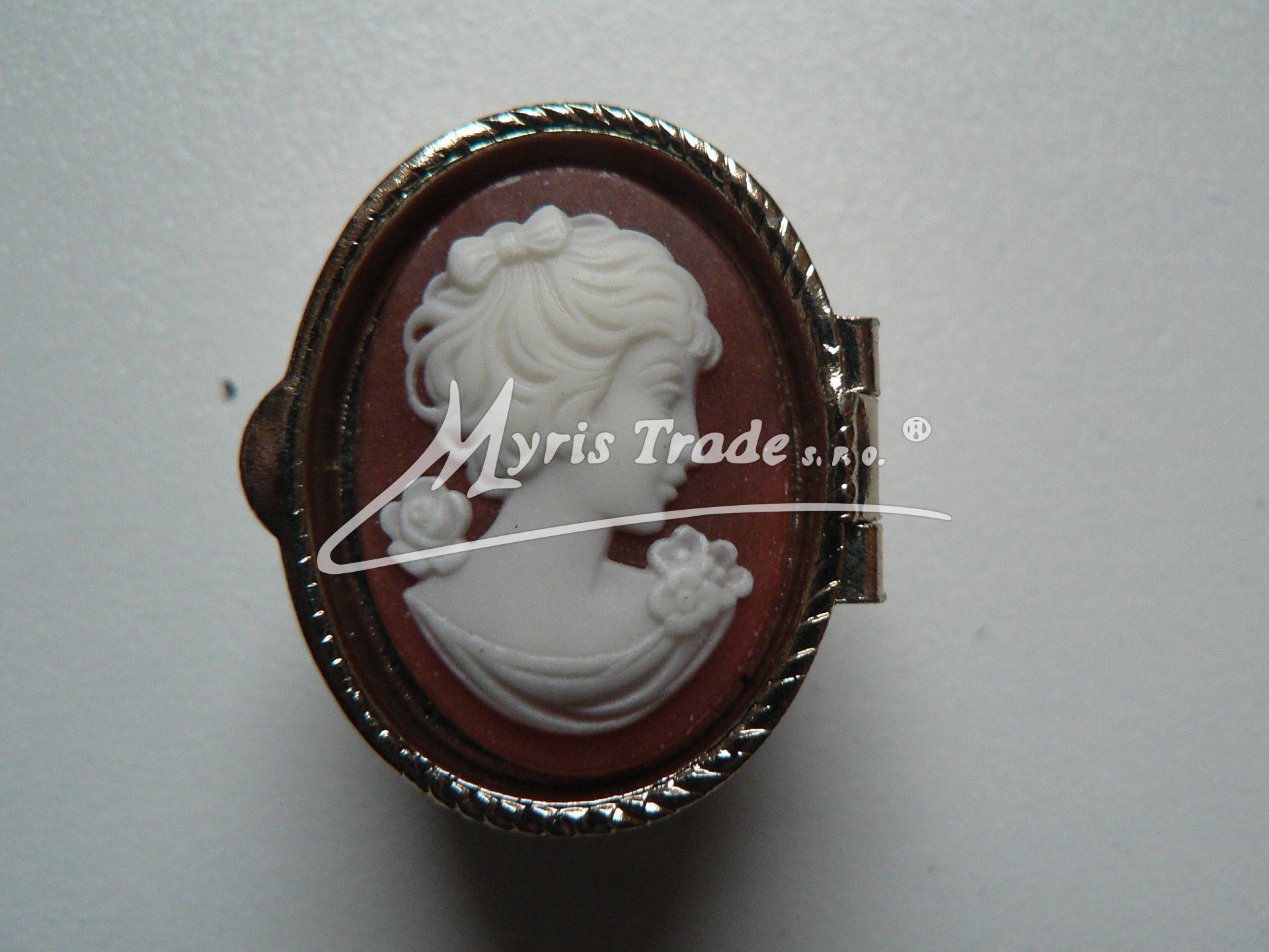 kulatá lékovka je vyrobena z kovu zlaté barvy s ozdobným víčkem s kamejí v barvě korálu a slonové kosti