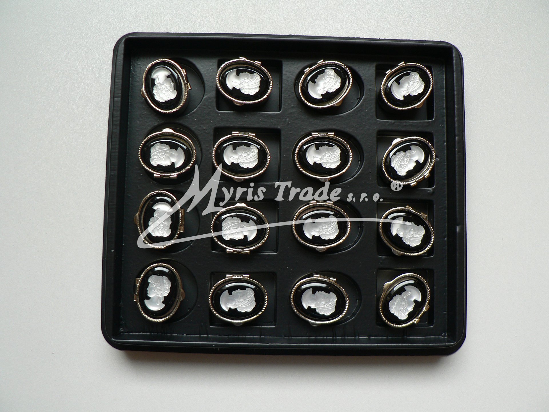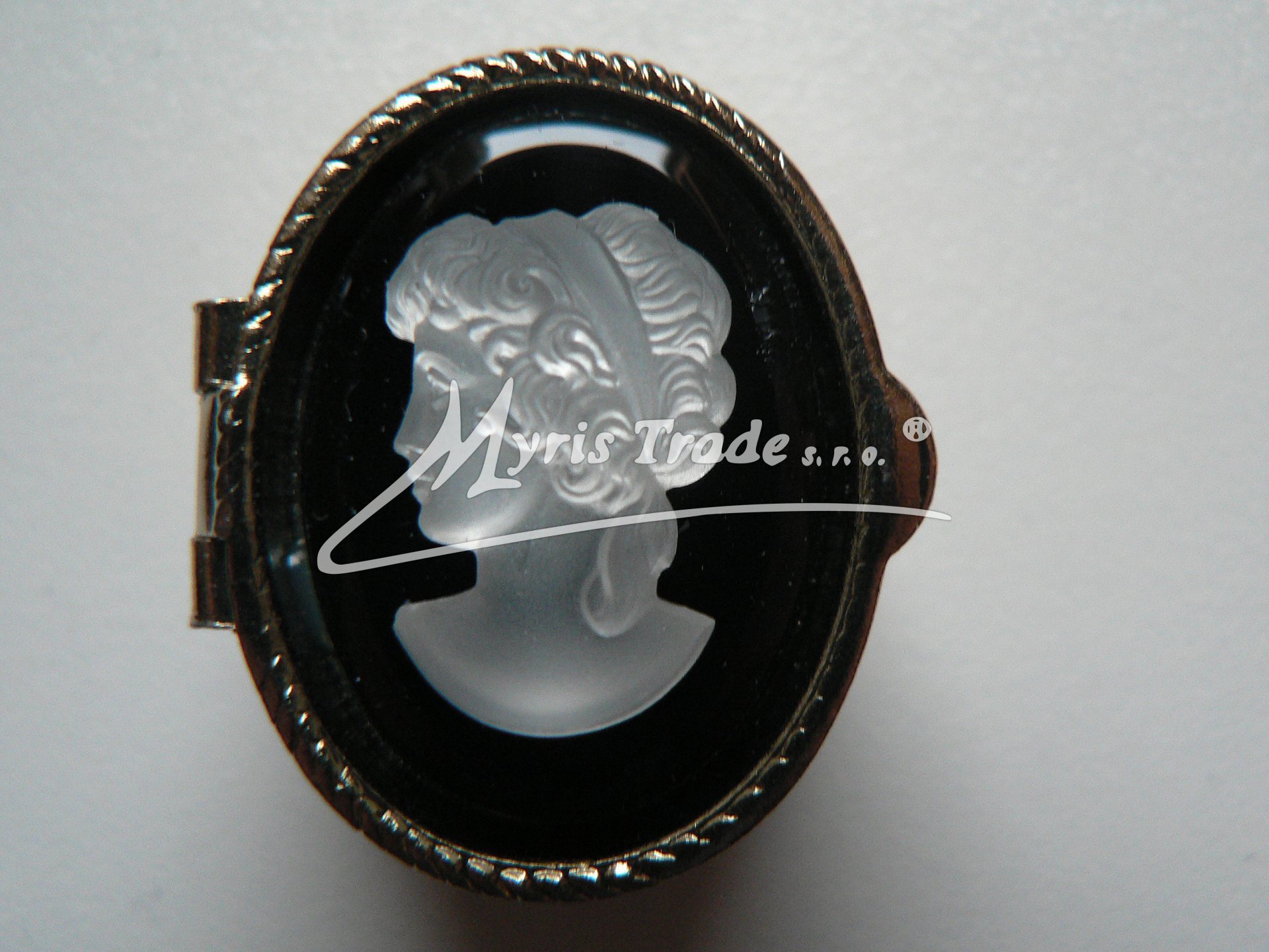 oválná lékovka je vyrobena z kovu zlaté barvy s ozdobným víčkem s kamejí v barvě černé a bílé