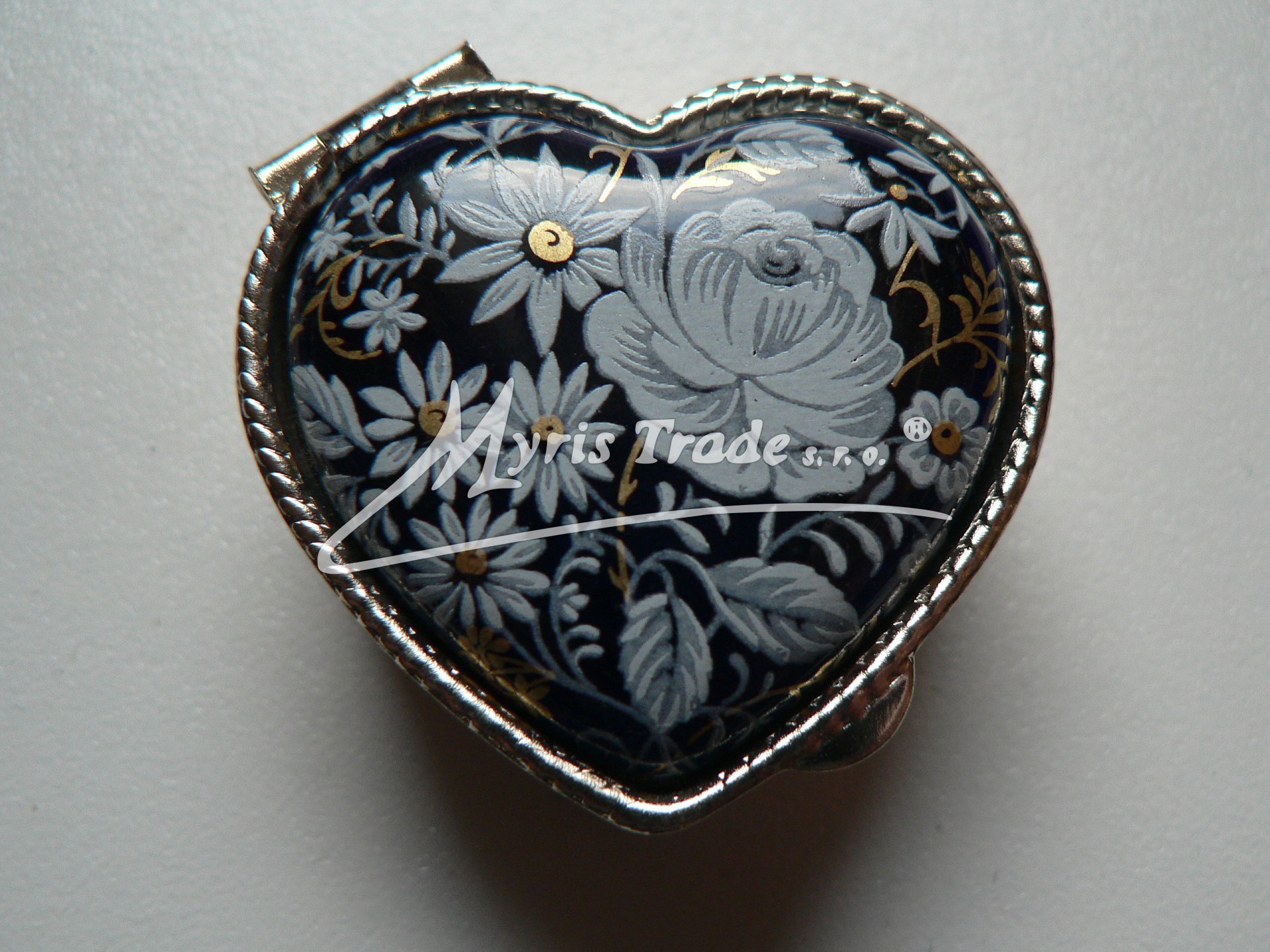 malá lékovka ve tvaru srdíčka je vyrobena z kovu zlaté barvy s porcelánovým víčkem s motivem květin