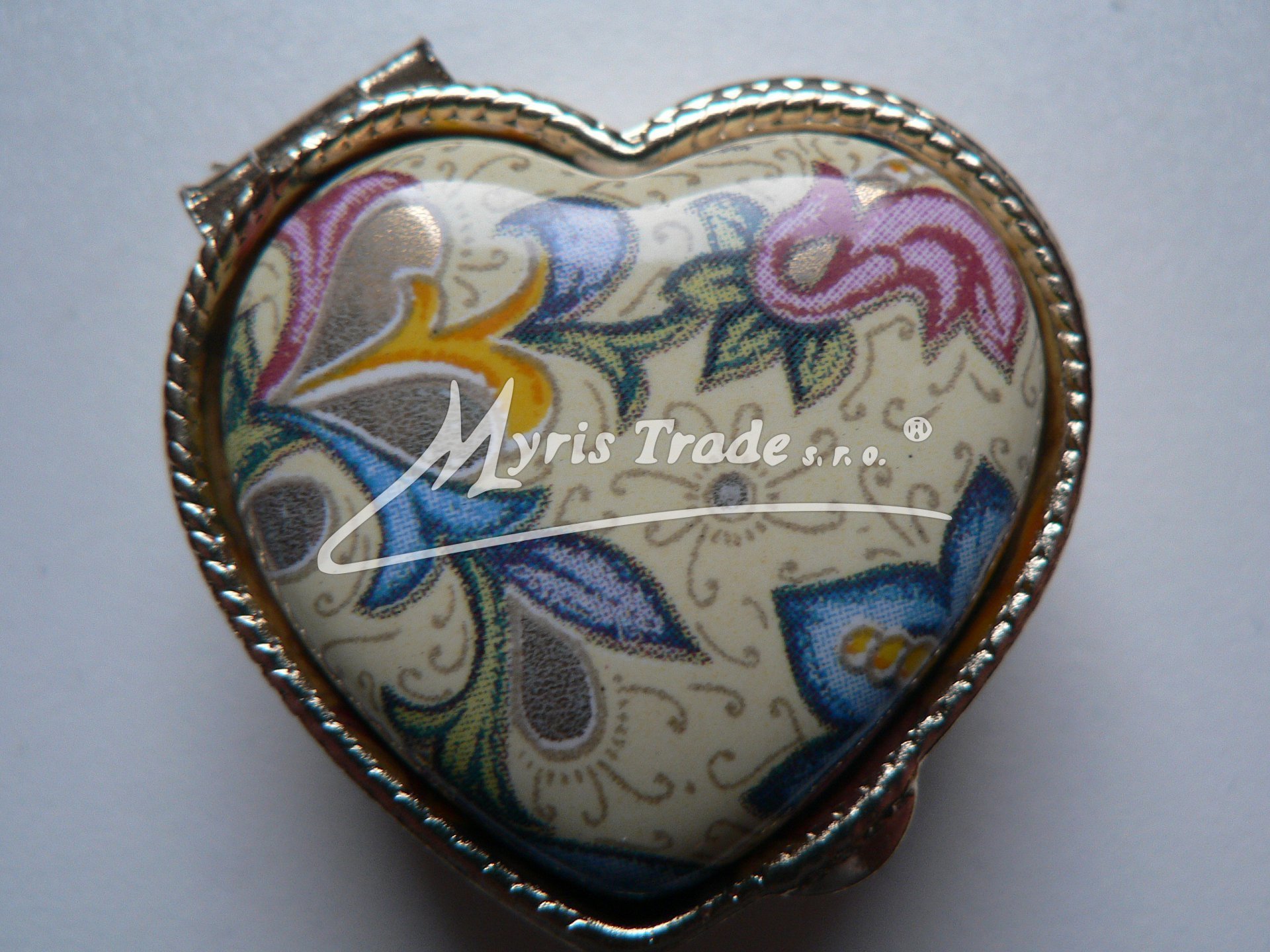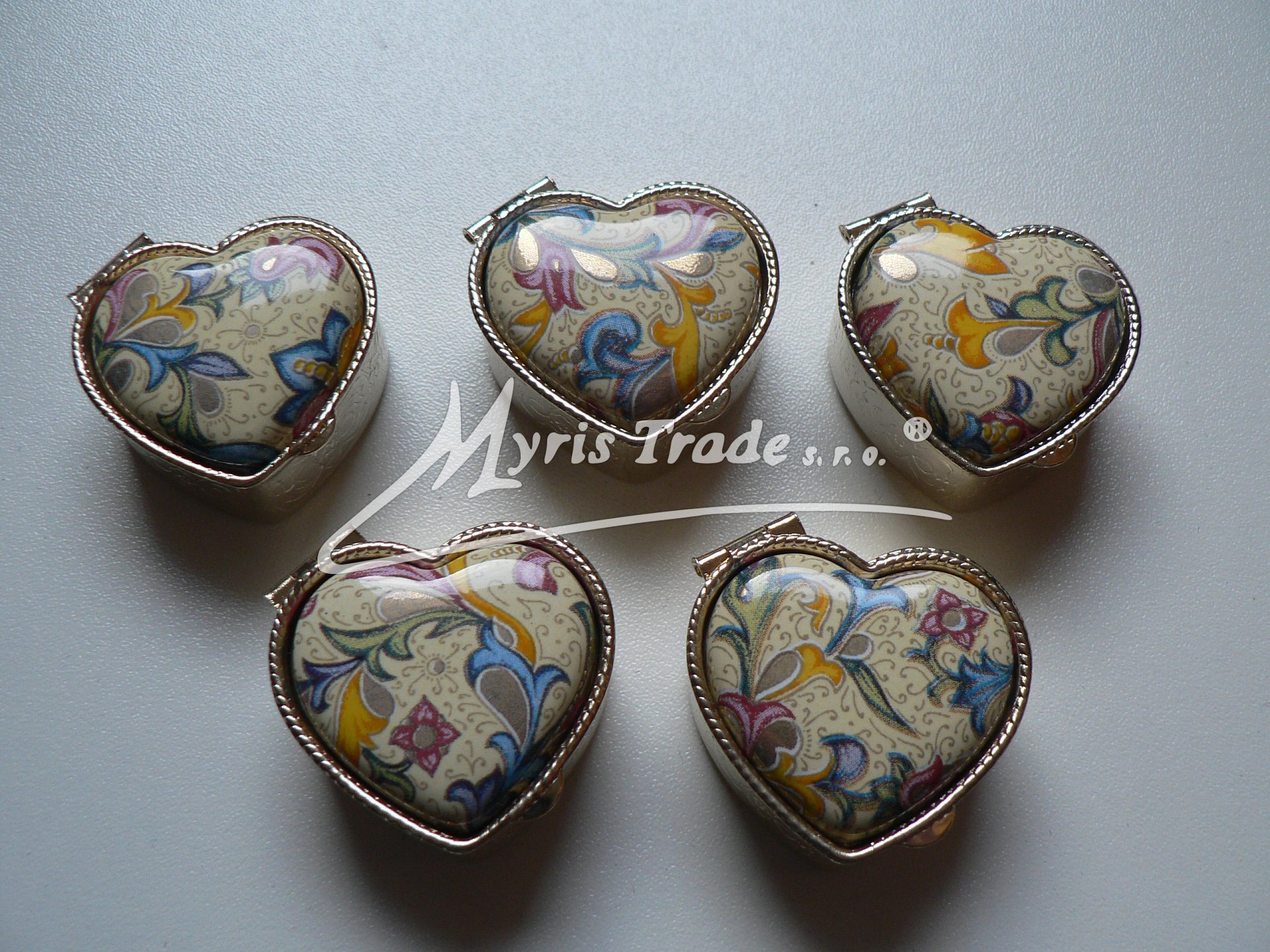 malá lékovka ve tvaru srdíčka je vyrobena z kovu zlaté barvy s porcelánovým víčkem s florentským motivem