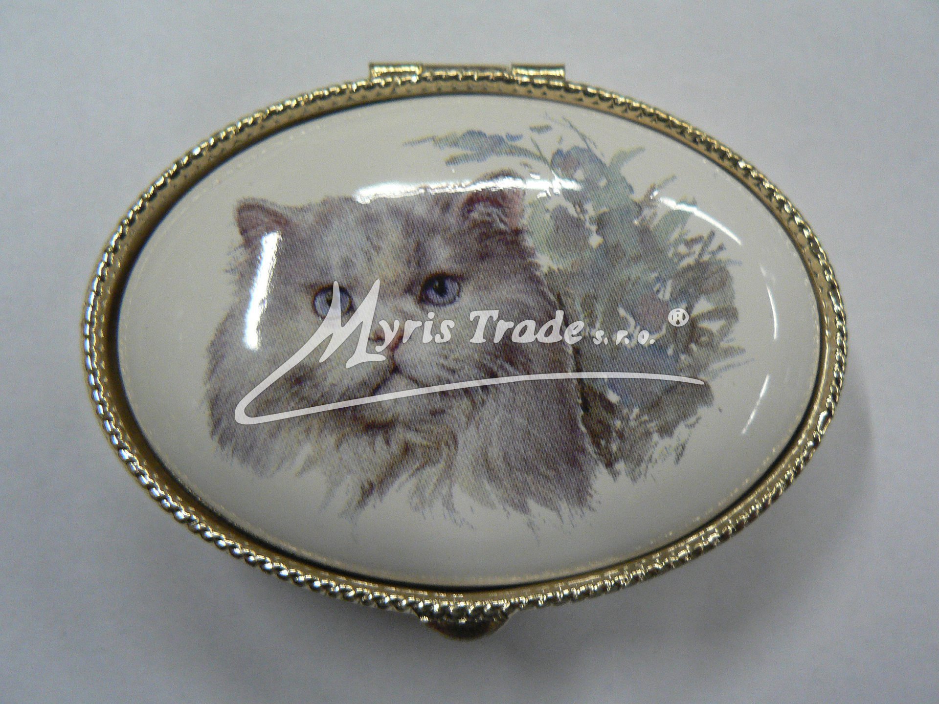 oválná lékovka je vyrobena z kovu zlaté barvy s porcelánovým víčkem s motivem hlavy kočky