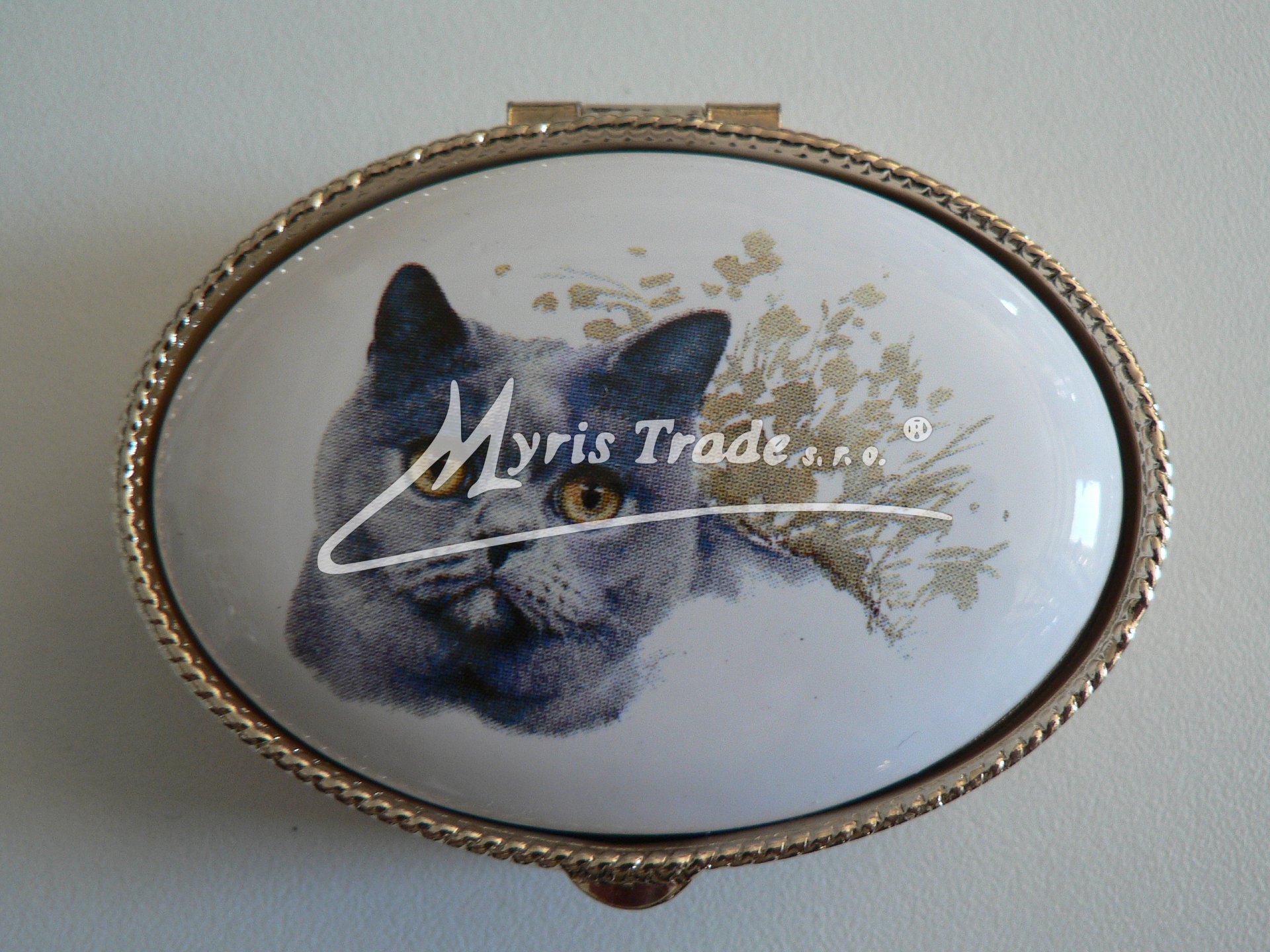 oválná lékovka je vyrobena z kovu zlaté barvy s porcelánovým víčkem s motivem hlavy kočky
