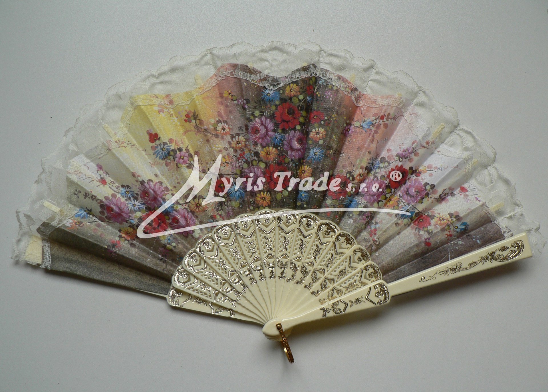 plastový vějíř s květinovým motivem a krajkou v barvě slonové kosti lze použít nejen jako krásnou dekoraci, ale je i plně funkční