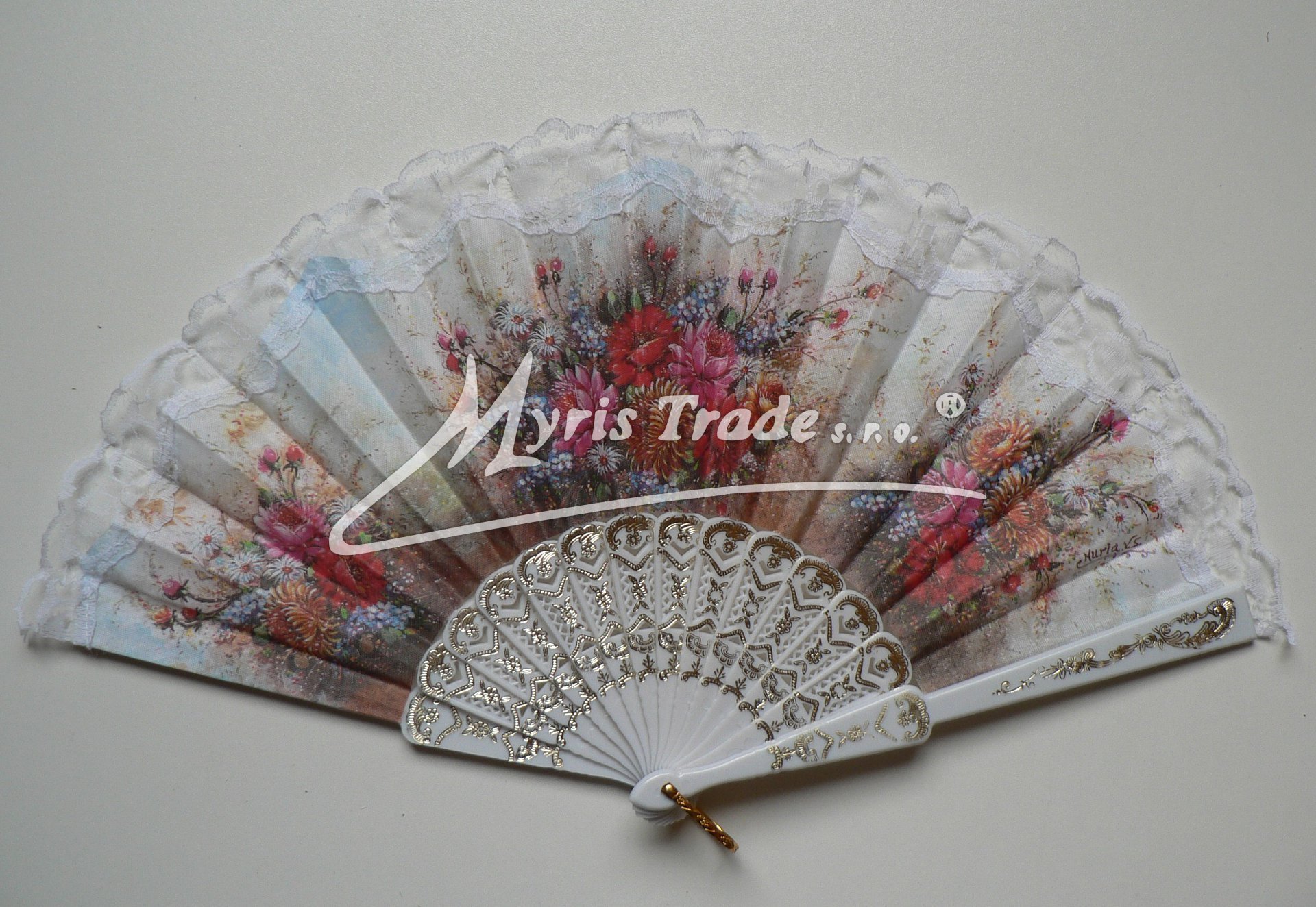 plastový vějíř s květinovým motivem a bílou krajkou lze použít nejen jako krásnou dekoraci, ale je i plně funkční