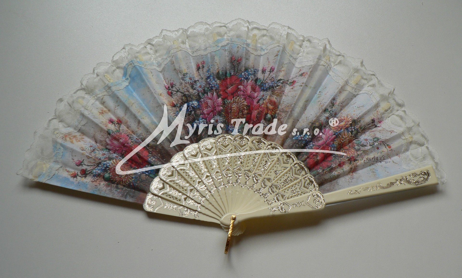 plastový vějíř s květinovým motivem a krajkou v barvě slonové kosti lze použít nejen jako krásnou dekoraci, ale je i plně funkční