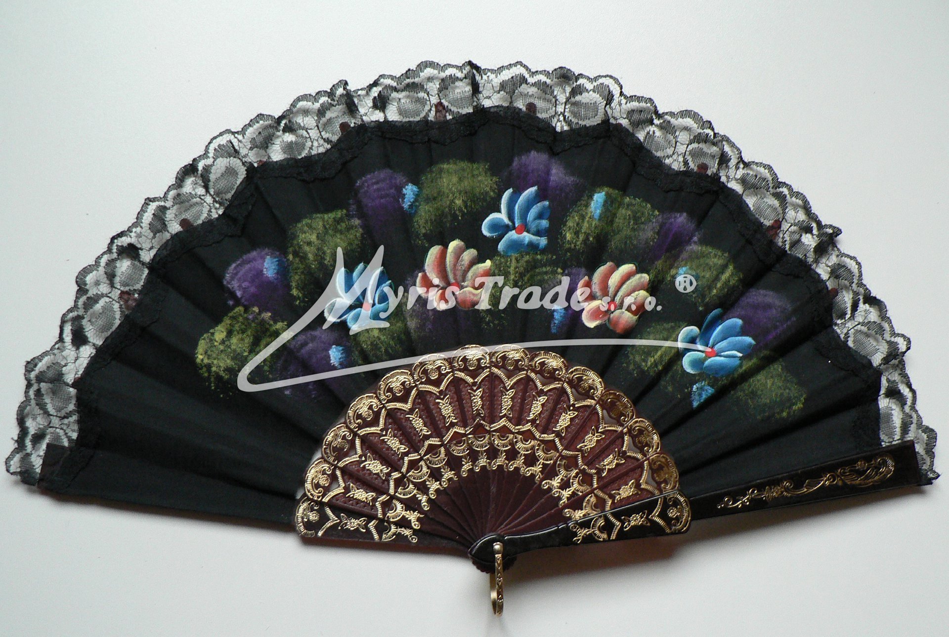 plastový vějíř s textilem a lemem z černé krajky je ručně malovaný květinovými motivy a lze jej použít nejen jako krásnou dekoraci, ale je i plně funkční