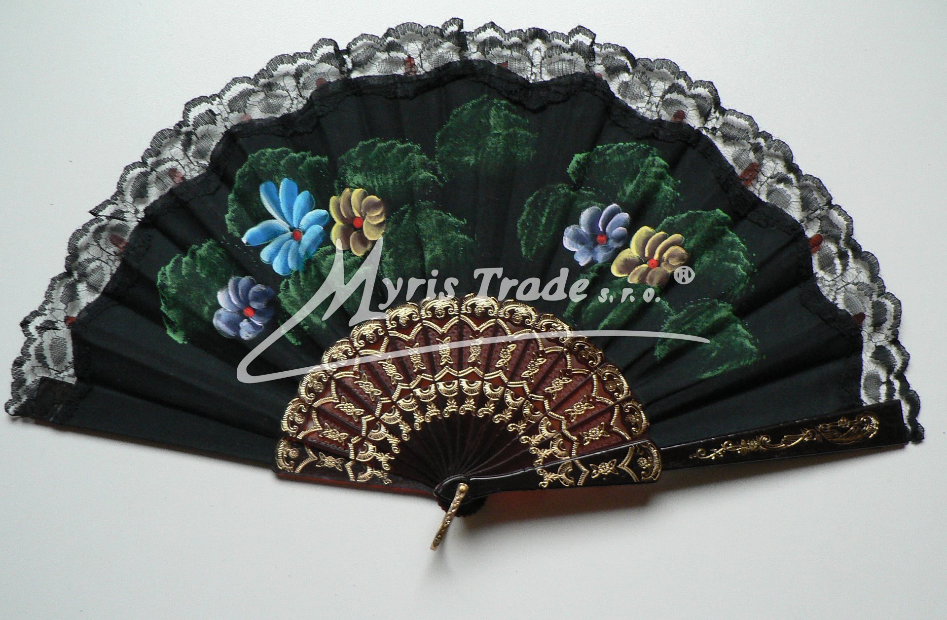plastový vějíř s textilem a lemem z černé krajky je ručně malovaný květinovými motivy a lze jej použít nejen jako krásnou dekoraci, ale je i plně funkční