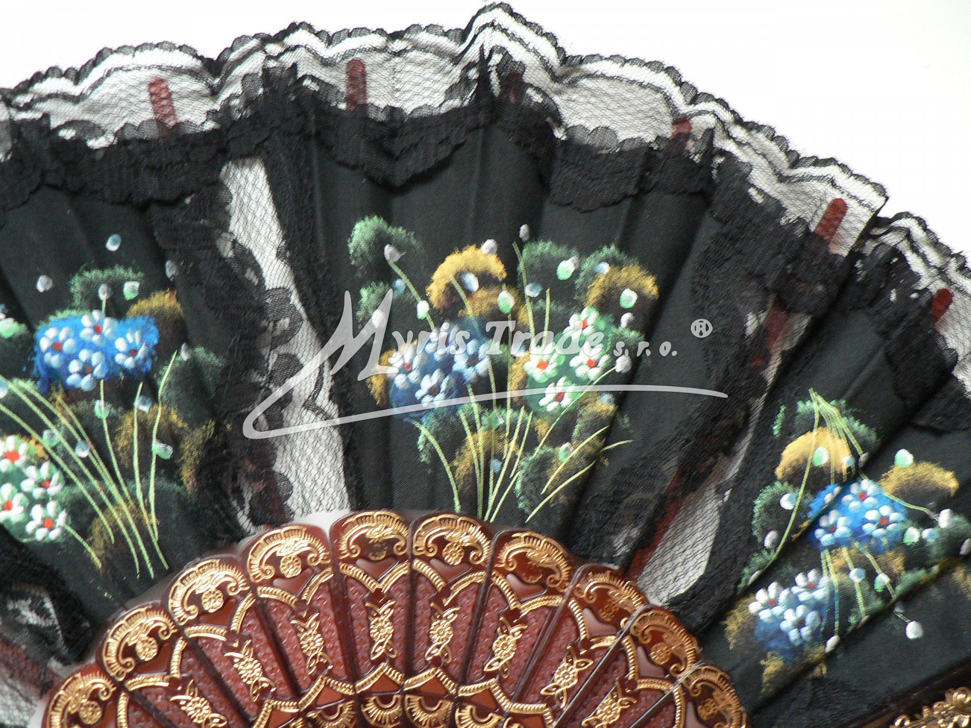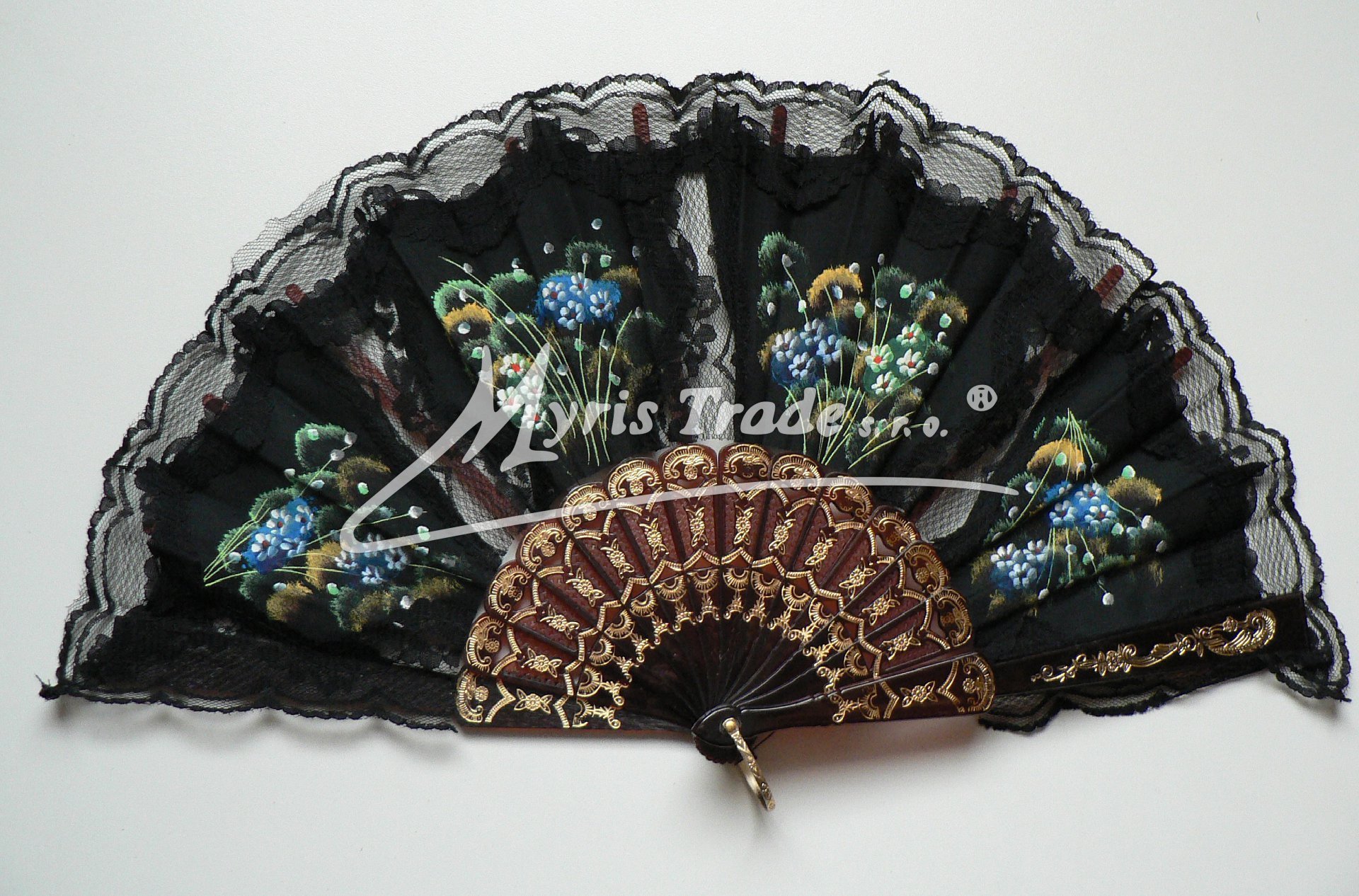 plastový vějíř s textilem a krajkou, s lemem z černé krajky, je ručně malovaný květinovými motivy a lze jej použít nejen jako krásnou dekoraci, ale je i plně funkční
