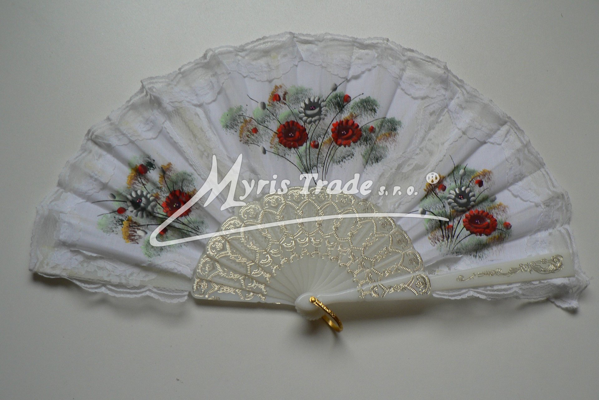 vějíř textilní s krajkou - ručně malovaný, bílý (333/B)