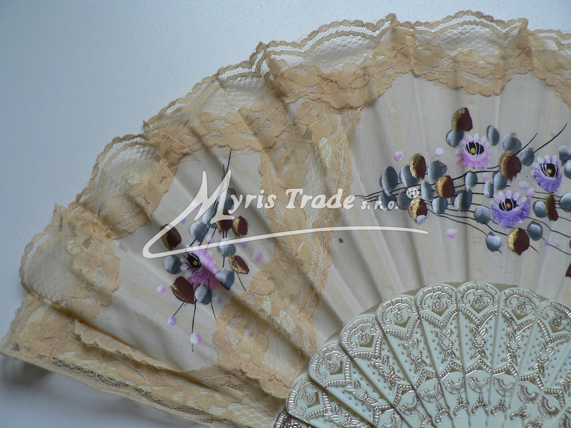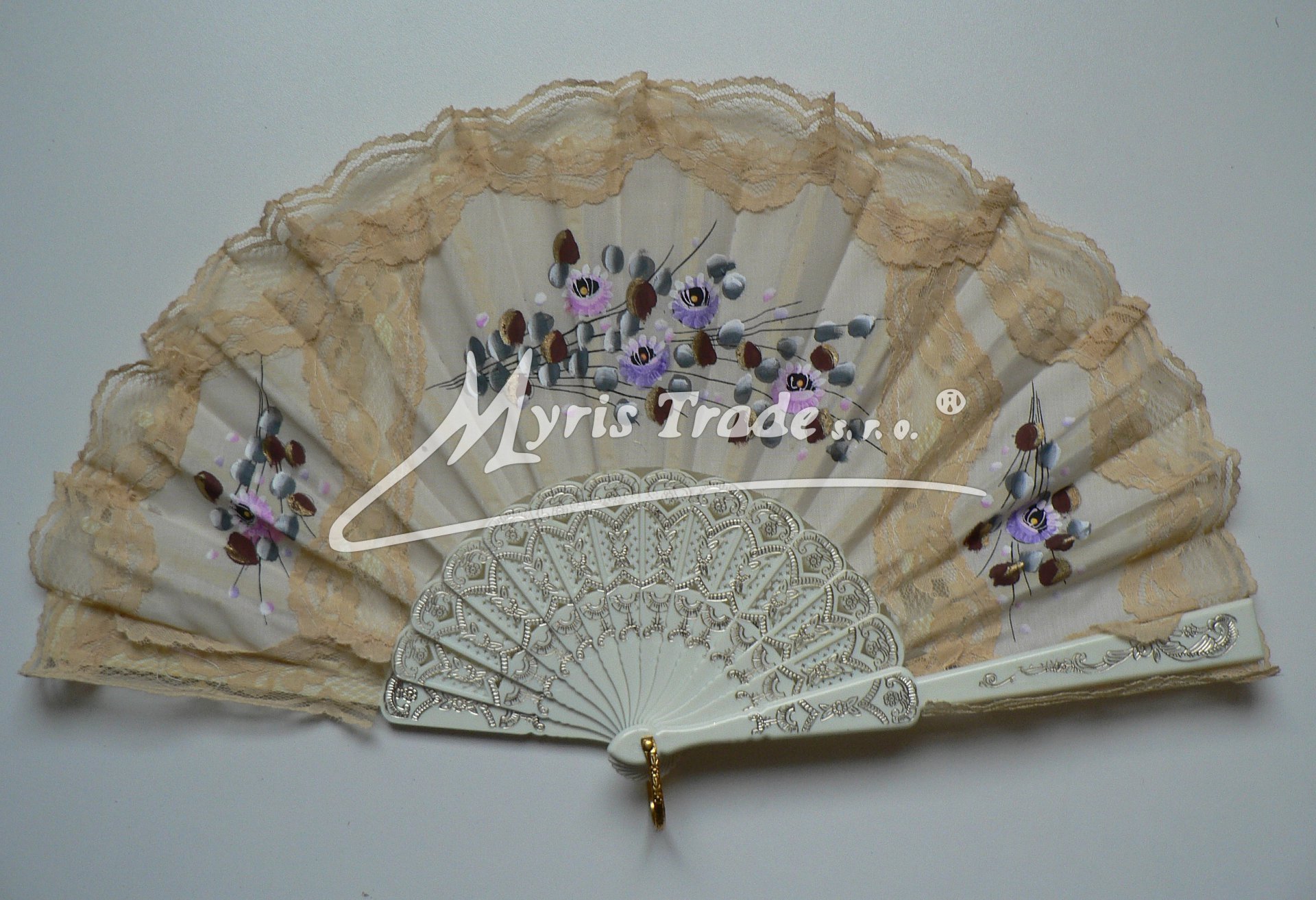 plastový vějíř s textilem a krajkou, s lemem z krajky v barvě slonové kosti, je ručně malovaný květinovými motivy a lze jej použít nejen jako krásnou dekoraci, ale je i plně funkční