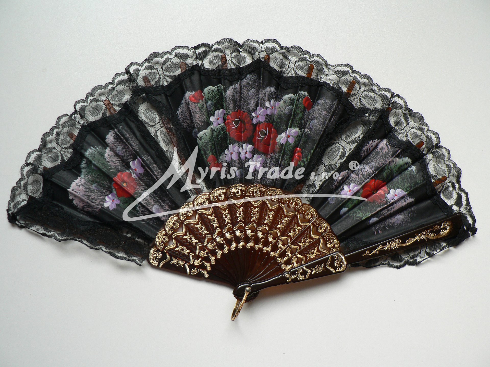 plastový vějíř s textilem a krajkou, s lemem z černé krajky, je ručně malovaný květinovými motivy a lze jej použít nejen jako krásnou dekoraci, ale je i plně funkční
