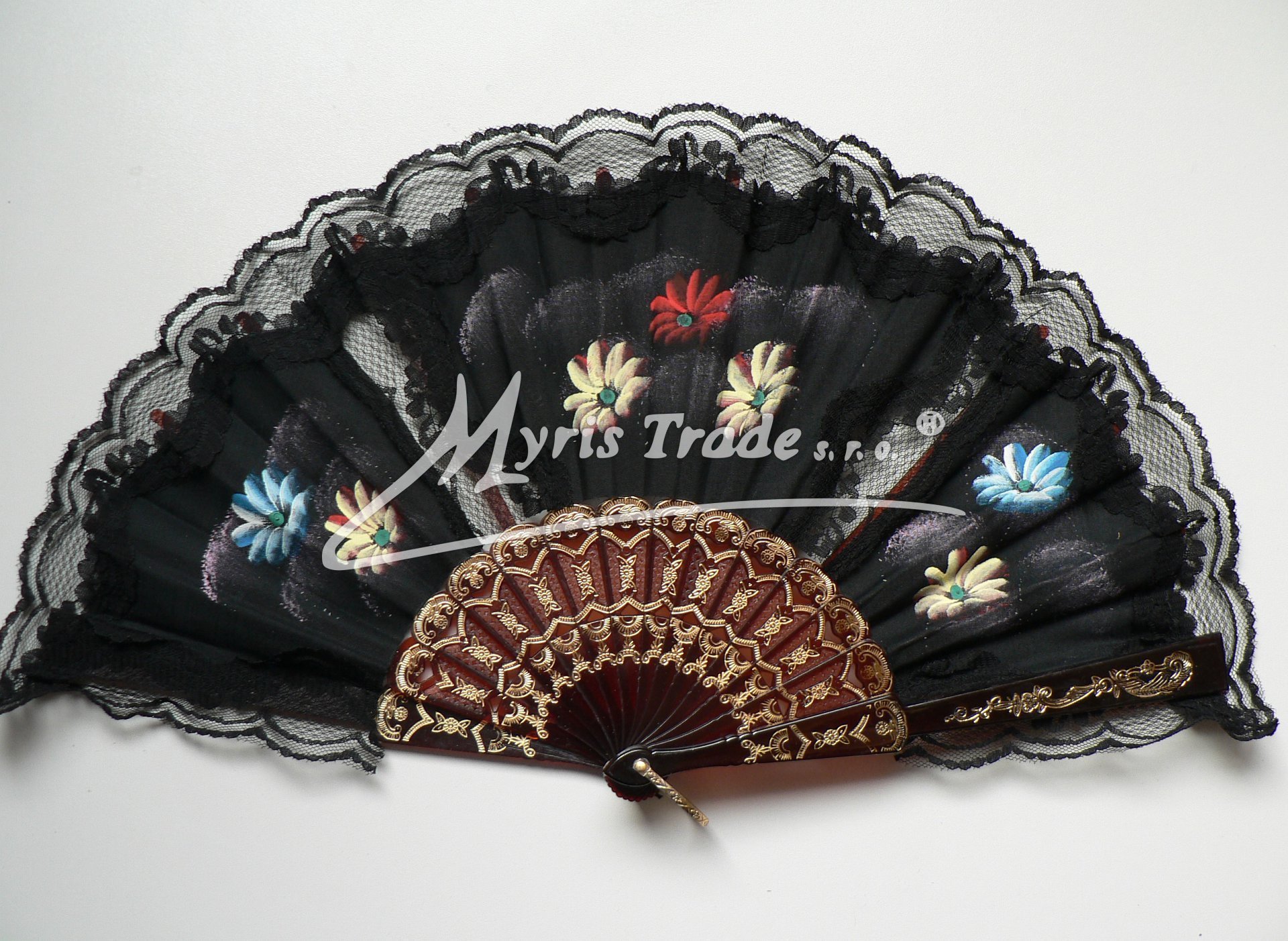 plastový vějíř s textilem a krajkou, s lemem z černé krajky, je ručně malovaný květinovými motivy a lze jej použít nejen jako krásnou dekoraci, ale je i plně funkční