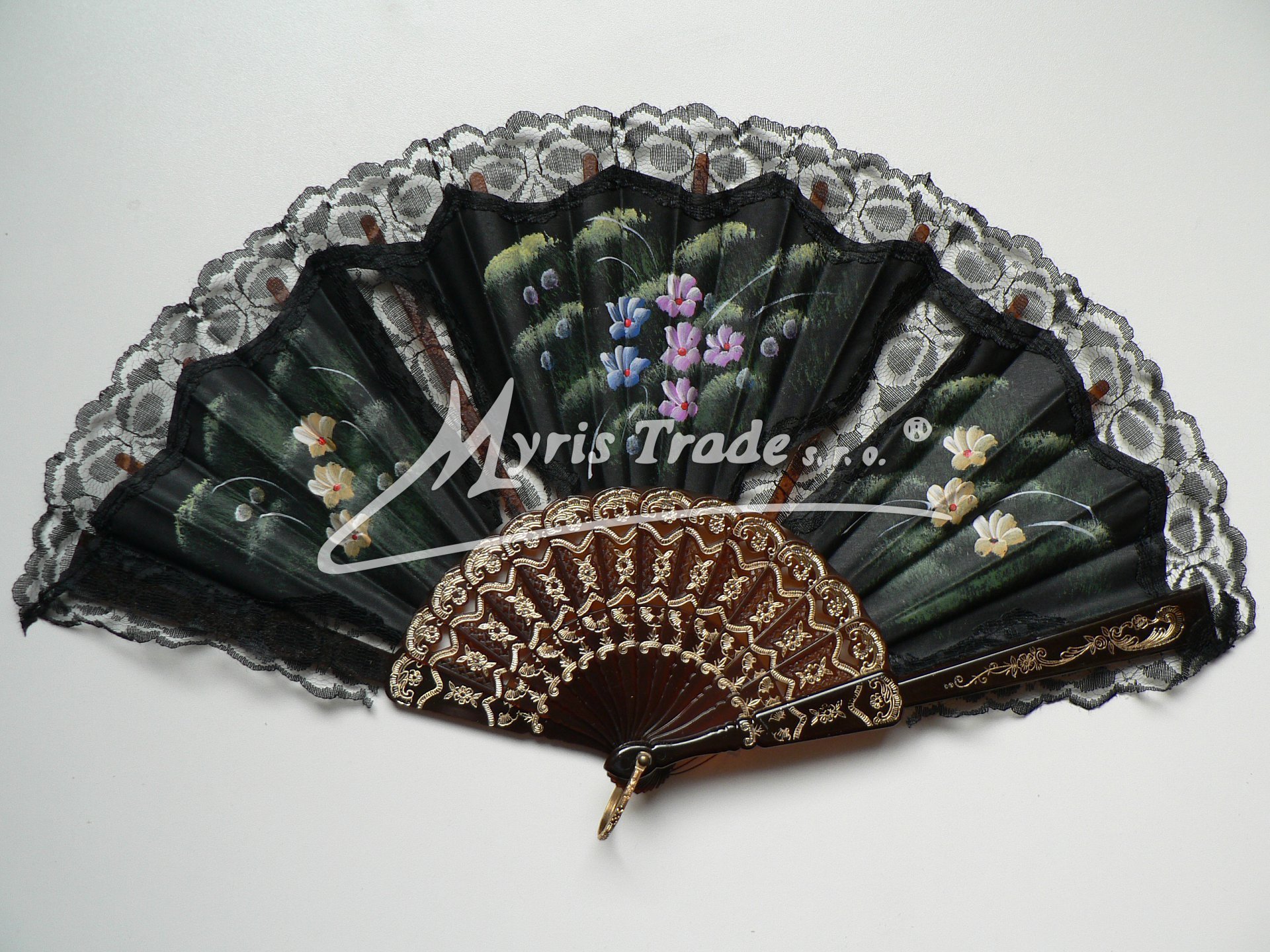 vějíř textilní s krajkou - ručně malovaný, černý (319/C)