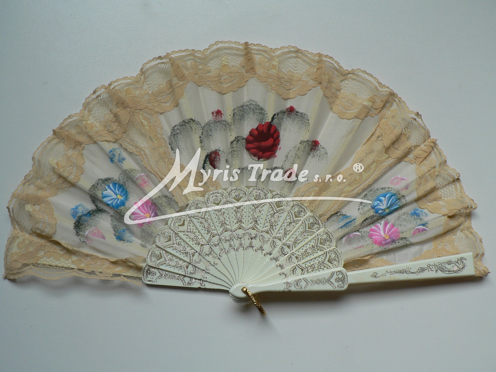 plastový vějíř s textilem a krajkou, s lemem z krajky v barvě slonové kosti, je ručně malovaný květinovými motivy a lze jej použít nejen jako krásnou dekoraci, ale je i plně funkční