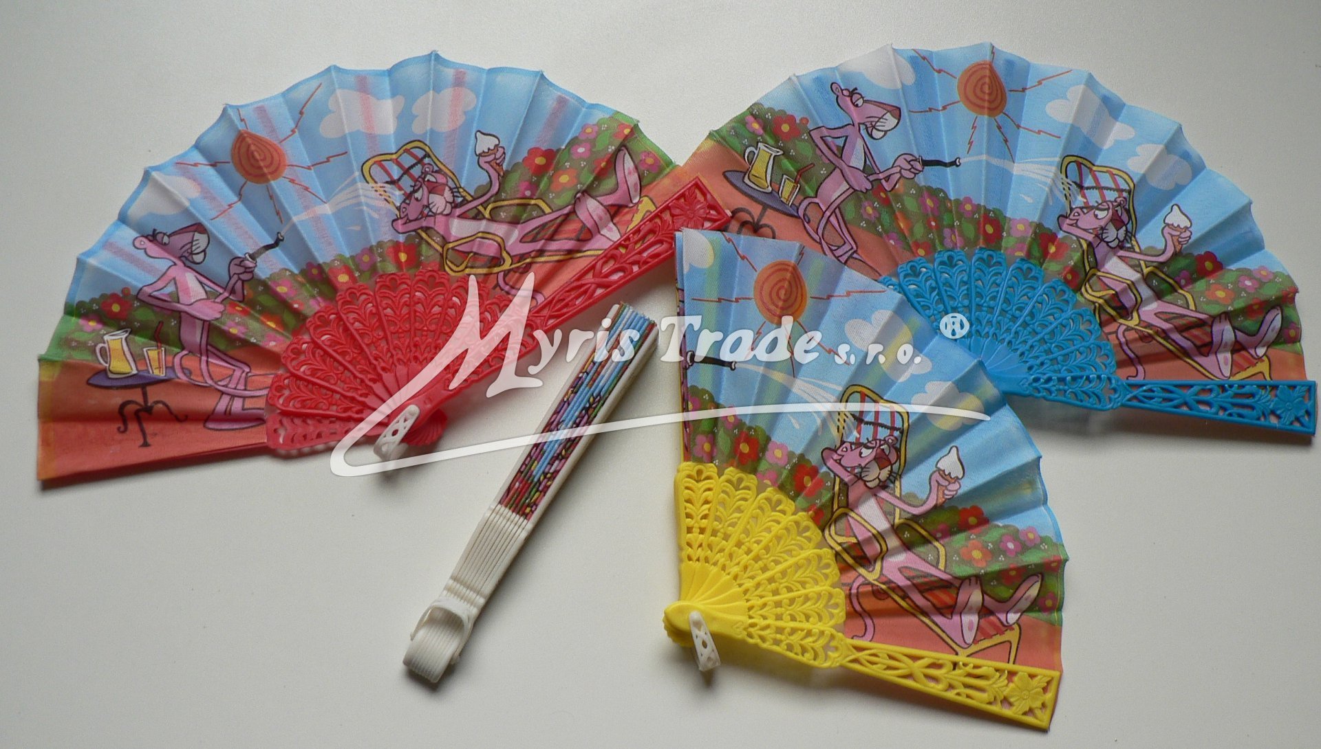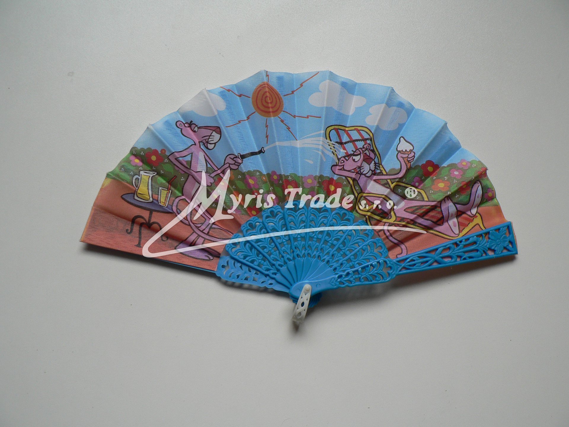 malé plastové vějíře s potištěným textilem s motivem postavičky Růžového pantera