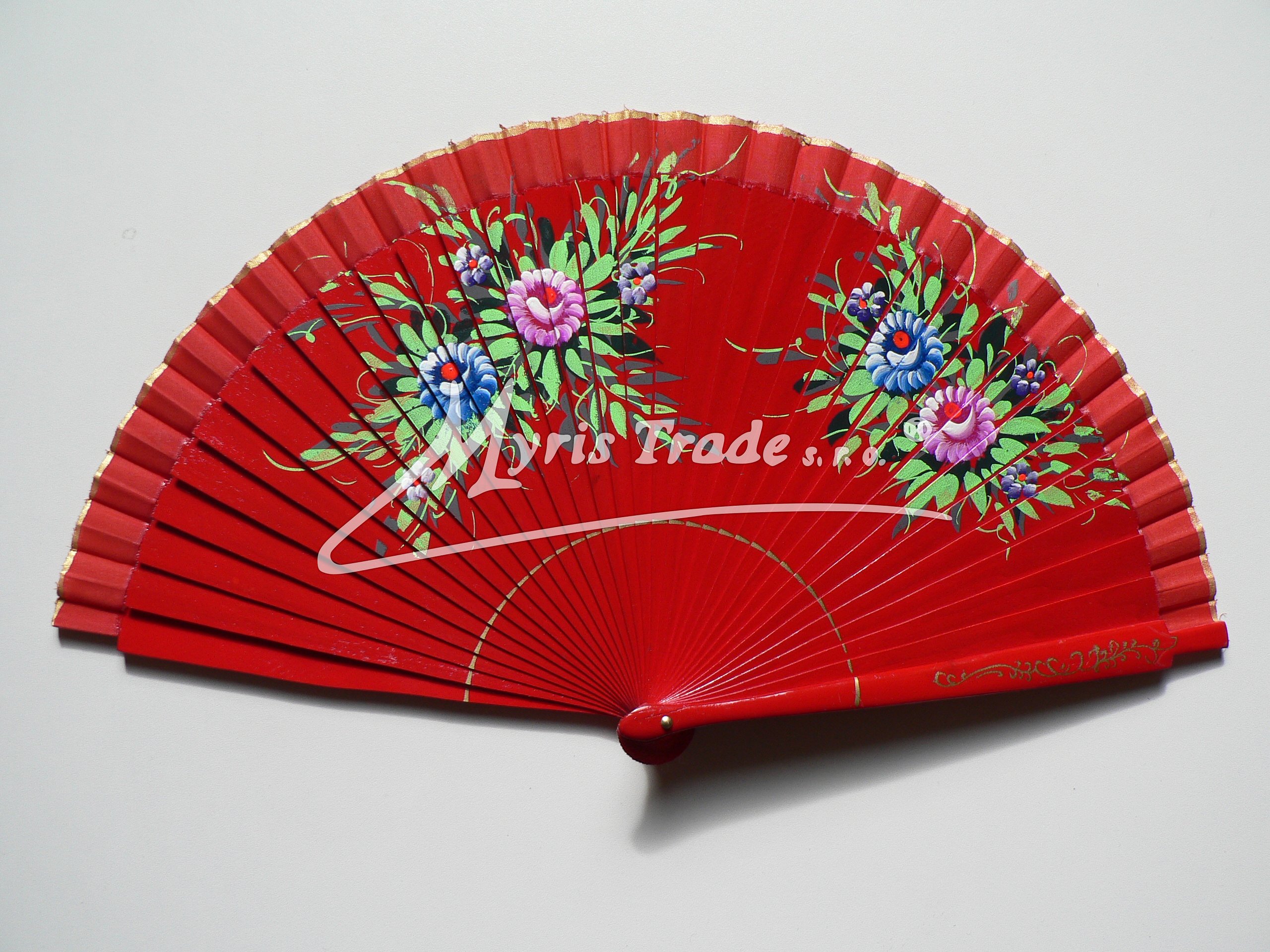 vějíř z lakovaného, hladkého dřeva a textilu, bohatě ručně malovaný květinovým motivem na obou stranách