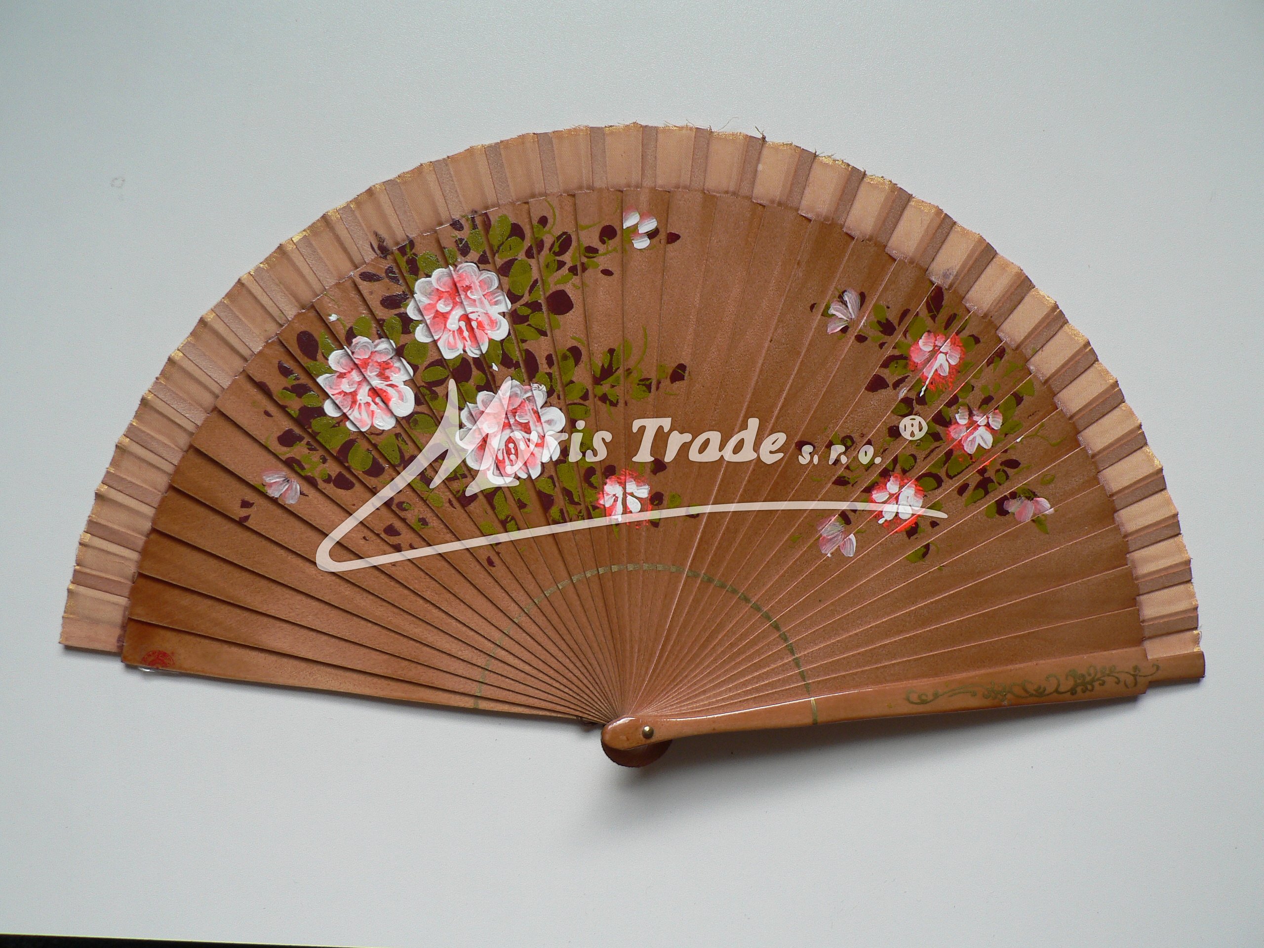 vějíř z lakovaného, hladkého dřeva a textilu, bohatě ručně malovaný květinovým motivem na obou stranách