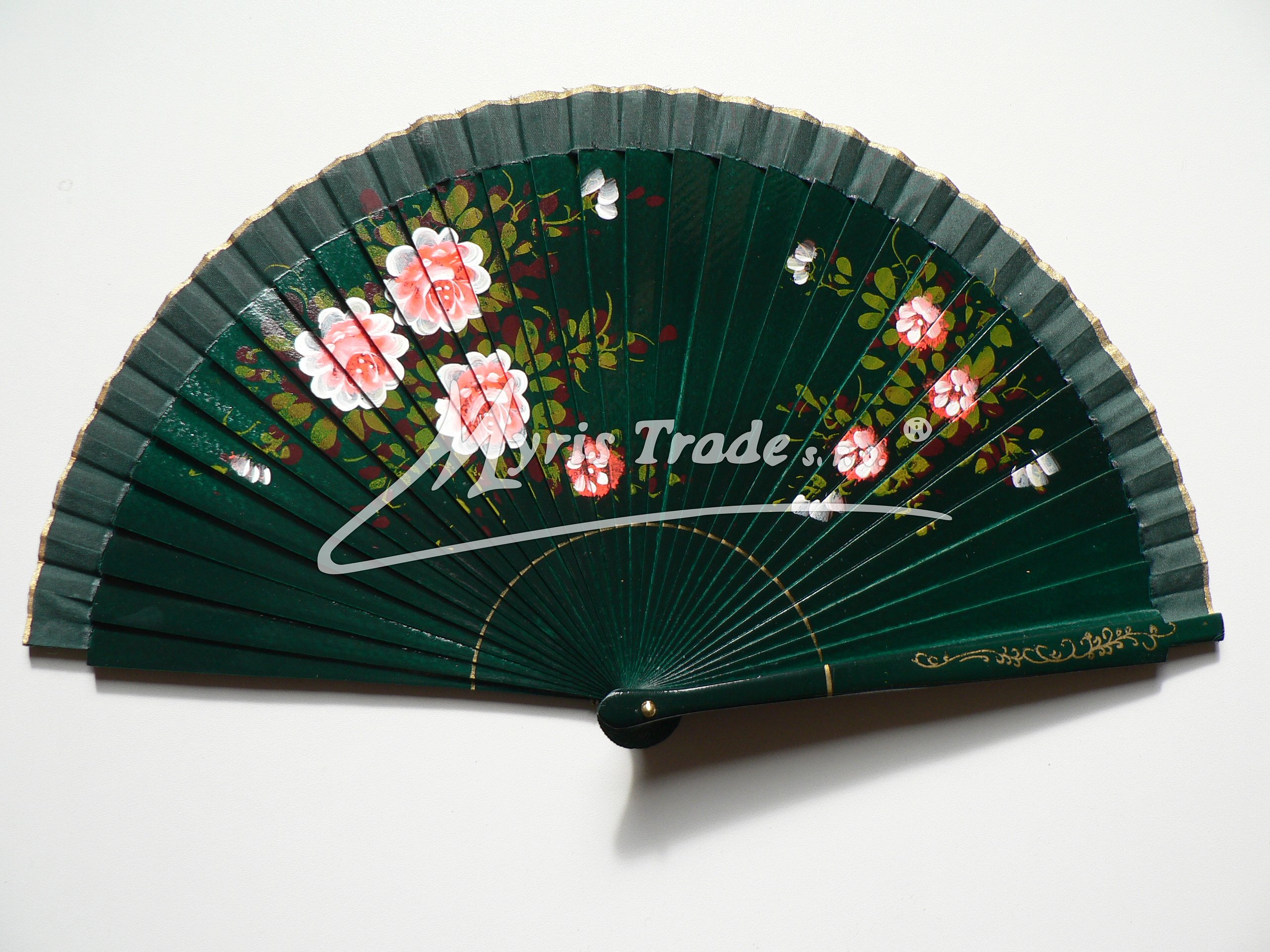 vějíř z lakovaného, hladkého dřeva a textilu, bohatě ručně malovaný květinovým motivem na obou stranách