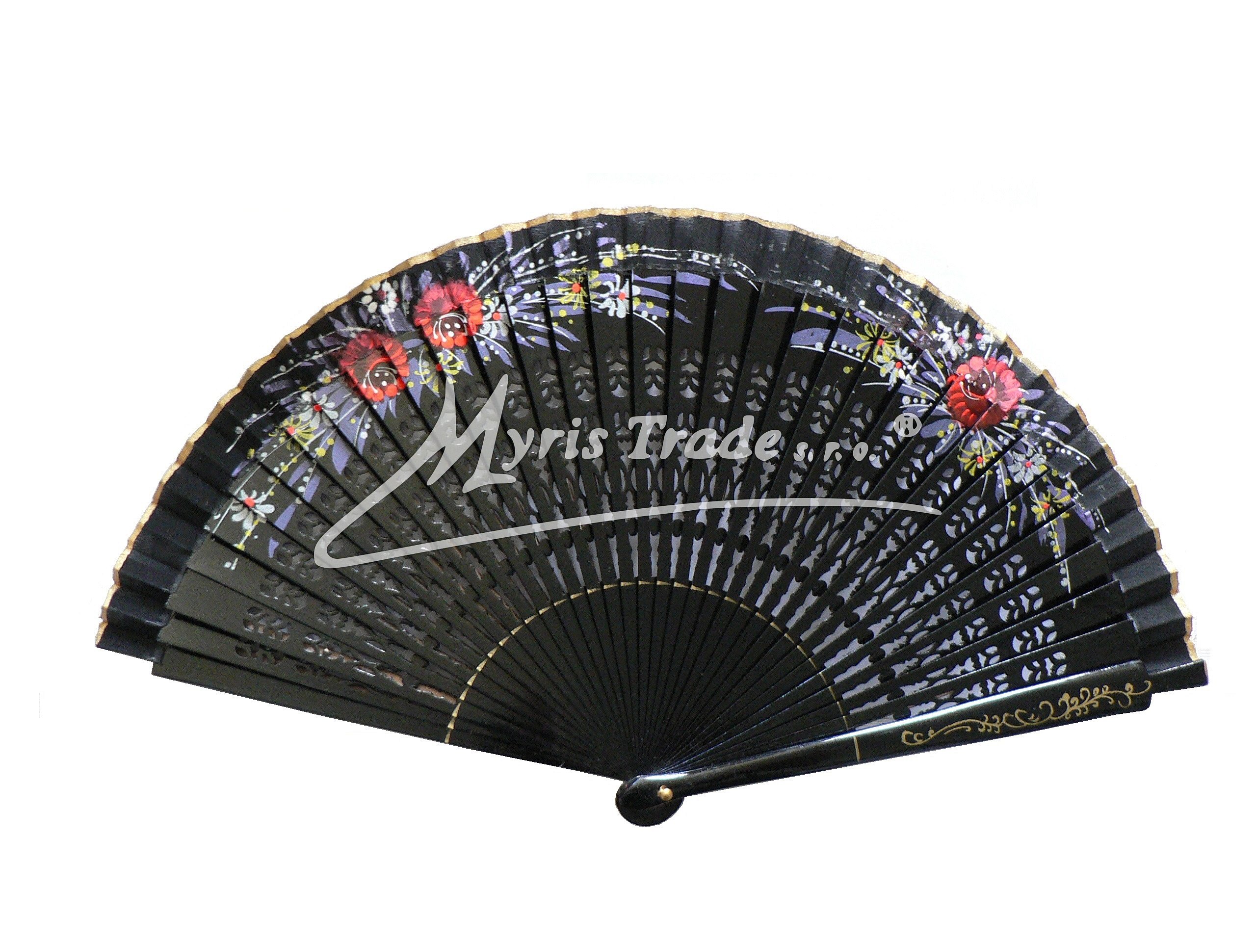 vějíř z lakovaného, vyřezávaného dřeva doplněného textilem, bohatě ručně malovaný stejným květinovým motivem na obou stranách
