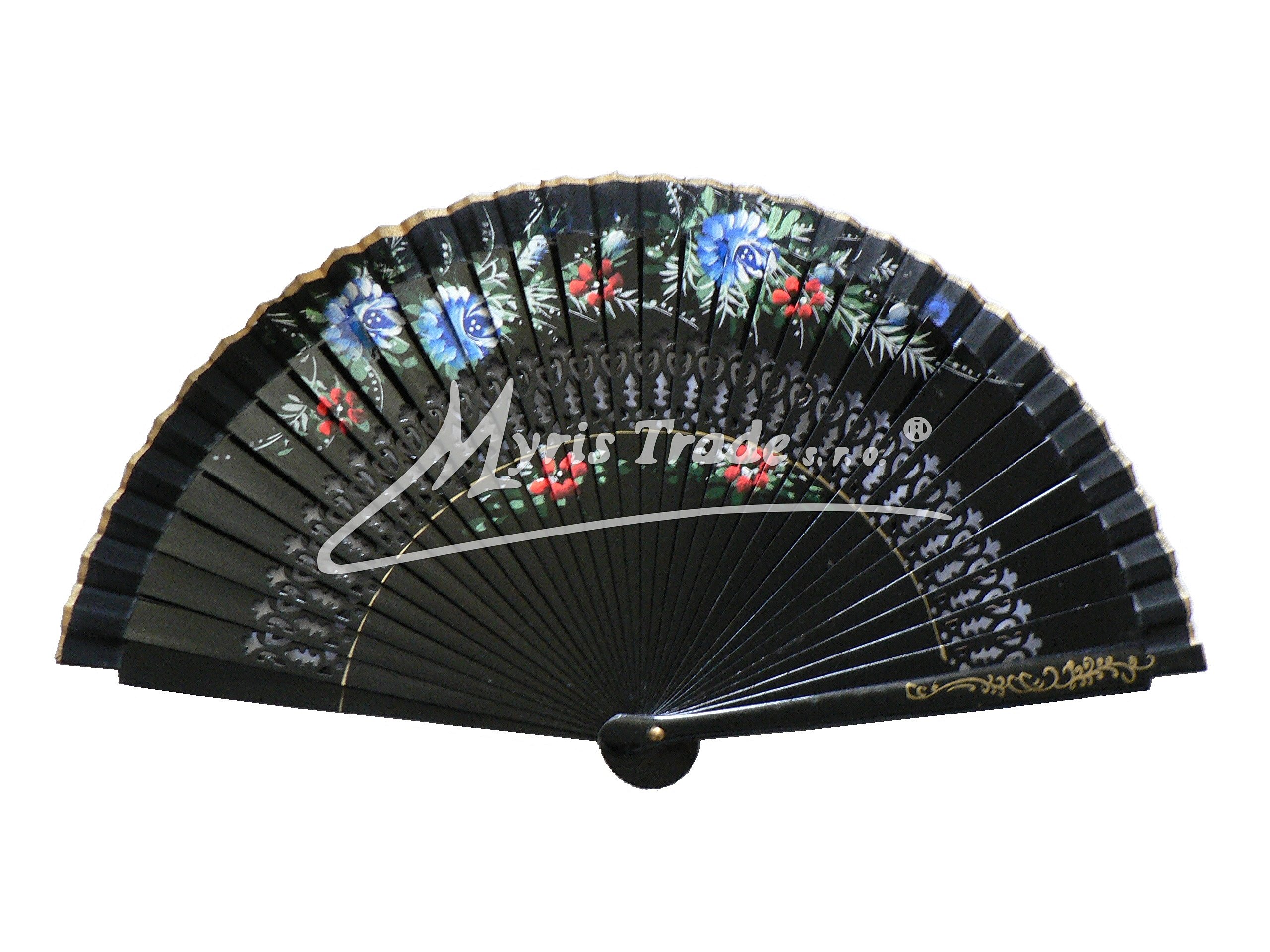 vějíř z lakovaného, vyřezávaného dřeva doplněného textilem, bohatě ručně malovaný stejným květinovým motivem na obou stranách
