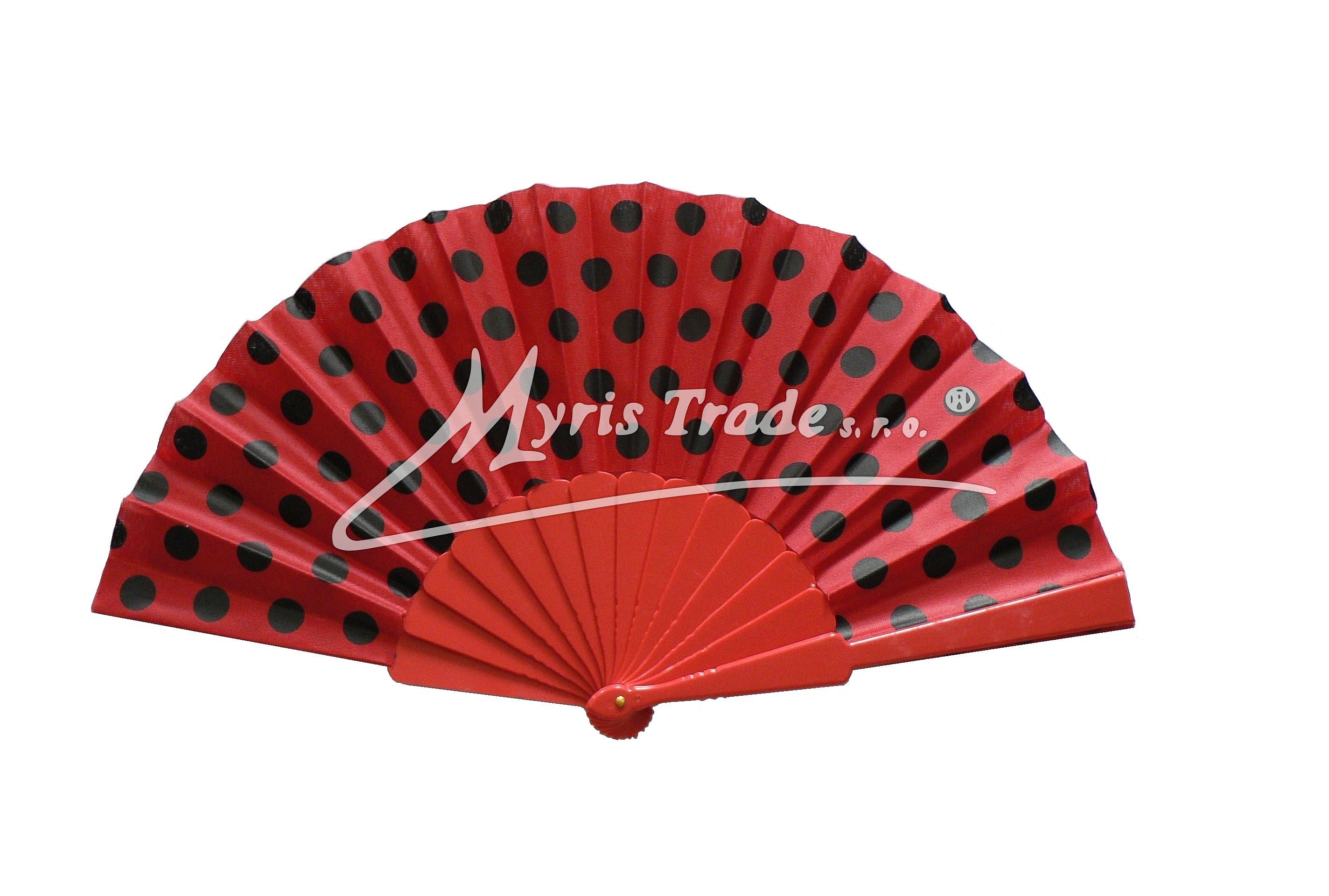 jednobarevný, plně funkční vějíř s plastovým korpusem a textilním potahem zdobený puntíky