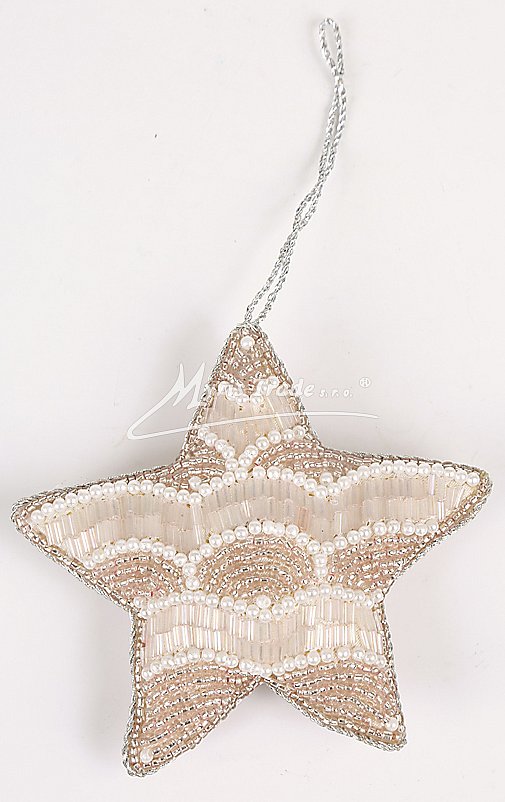 Hvězda pošitá perličkami a korálky. Hvězda může sloužit jako vánoční ozdoba, nebo i jako dekorace mimo vánoční sezonu