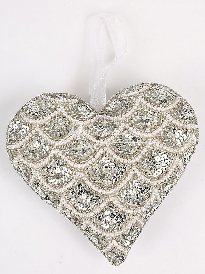 Velké srdce pošité perličkami a korálky. Srdce může sloužit jako vánoční ozdoba, nebo i jako dekorace mimo vánoční sezonu. Vhodné i pro zavěšení na dveře.