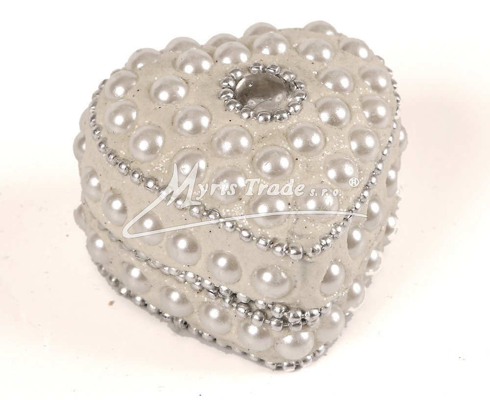 malá ozdobná šperkovnička - ve tvaru srdce, zdobená bílými perličkami a kamínkem na víčku