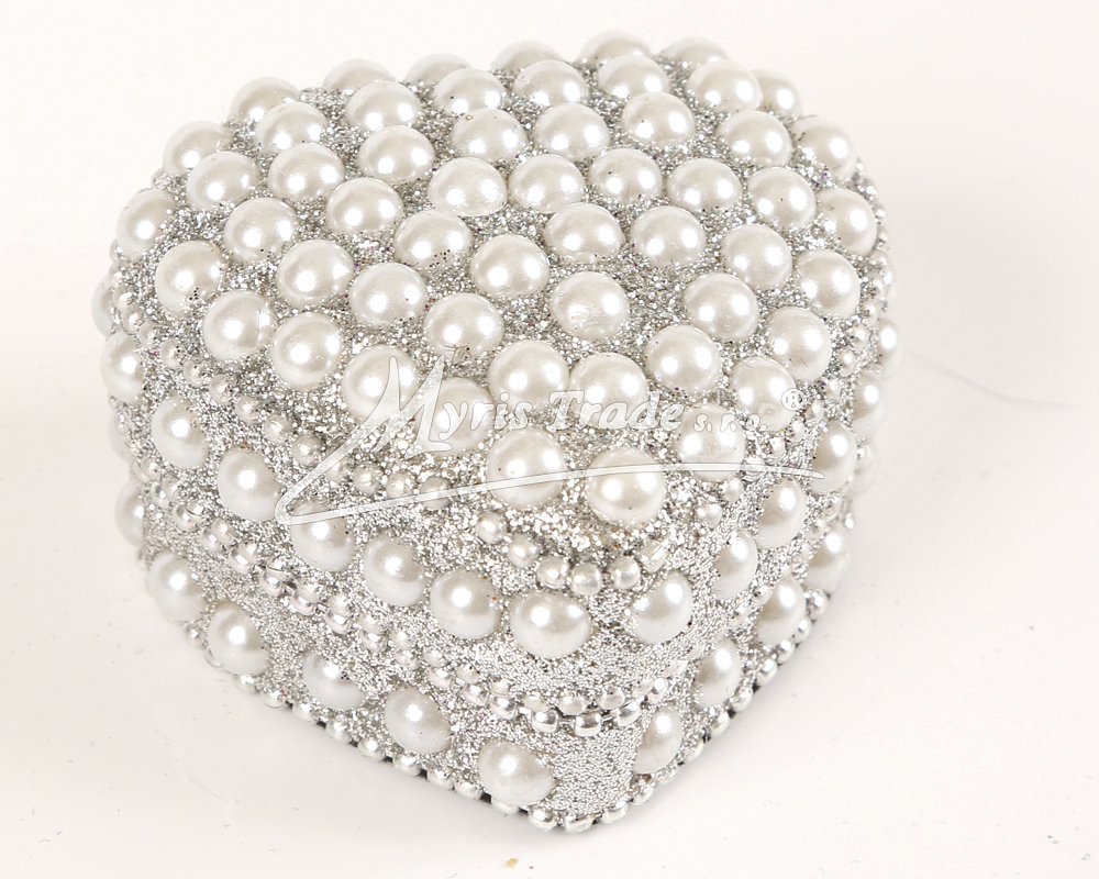 malá ozdobná šperkovnice - ve tvaru srdce, zdobená perličkami ve stříbrné barvě