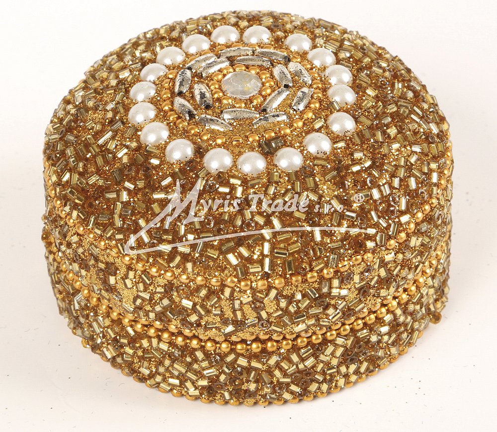 ozdobná kulatá šperkovnice - zdobená korálky, kamínky a perličkami