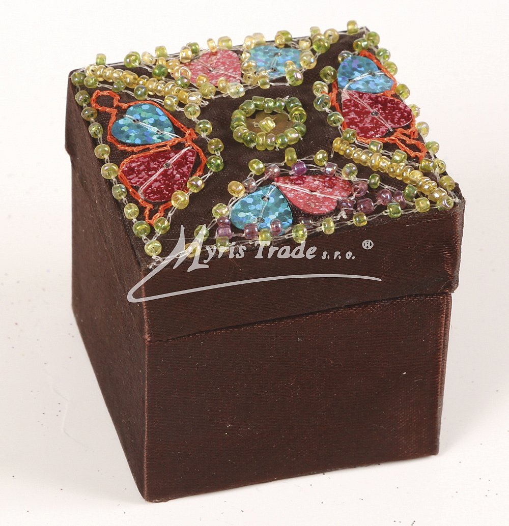 ozdobná čtvercová šperkovnice potažená textilem - na víčku zdobená korálky, flitry a bohatou výšivkou