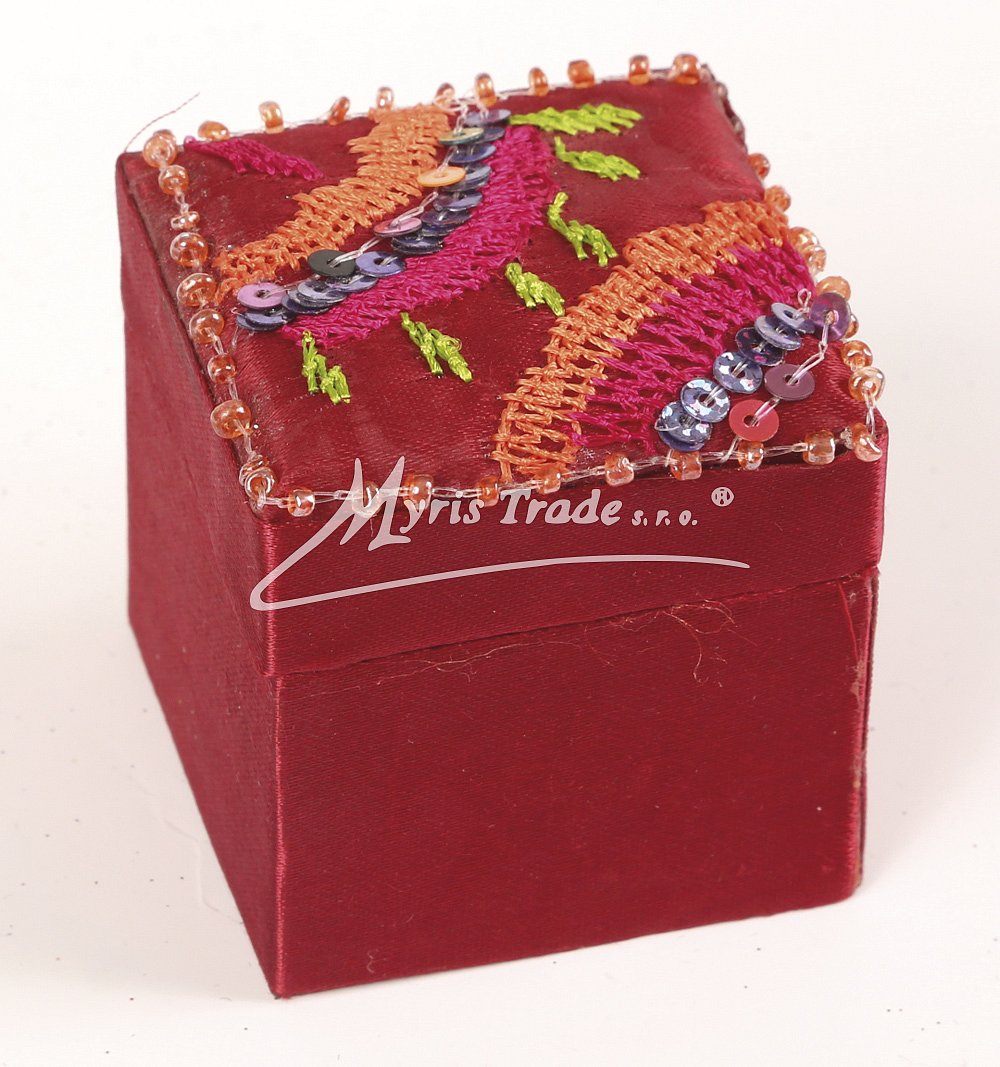 ozdobná čtvercová šperkovnice potažená textilem - na víčku zdobená korálky, flitry a bohatou výšivkou
