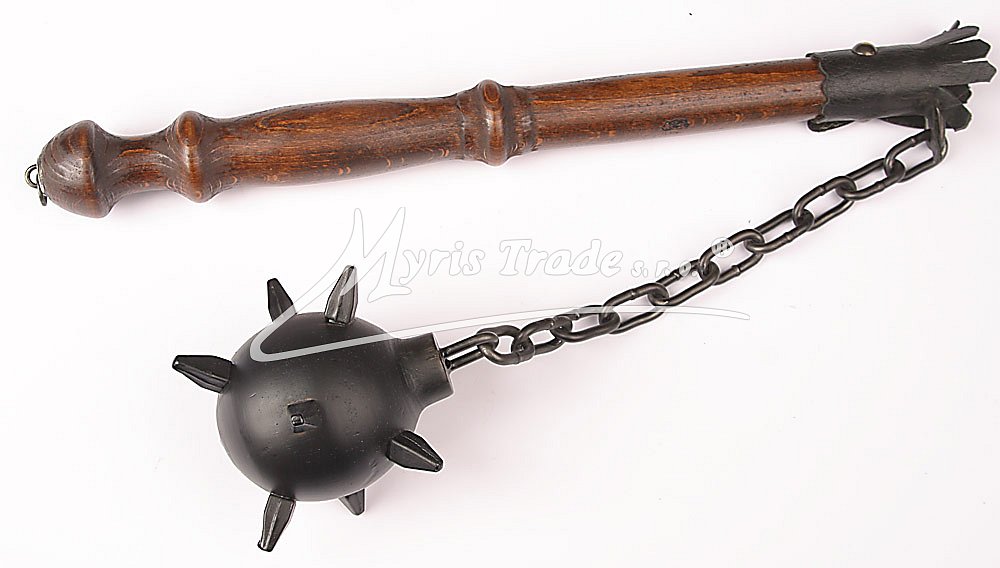 historická replika řemdichu s dřevěnou rukojetí a jednou dřevěnou koulí s kovovými hroty