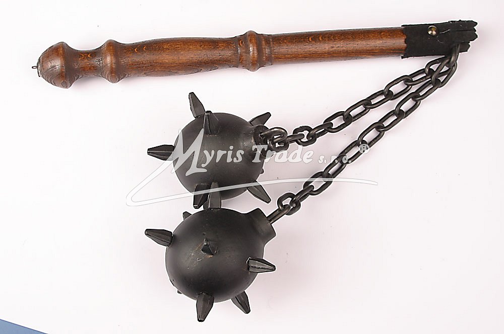 historická replika řemdichu s dřevěnou rukojetí a dvěma dřevěnými koulemi s kovovými hroty