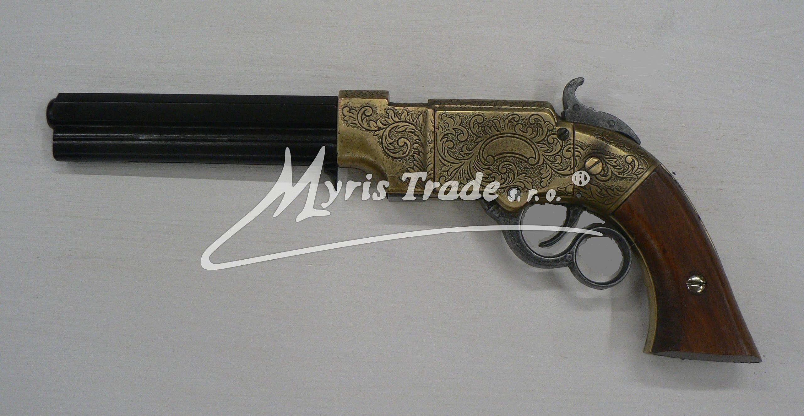 nefunkční replika historické pistole system WINCHESTER z kovové slitiny zdobené mosazí, s dřevěnou pažbou; hlaveň v černé barvě; mechanizmus je funkční.