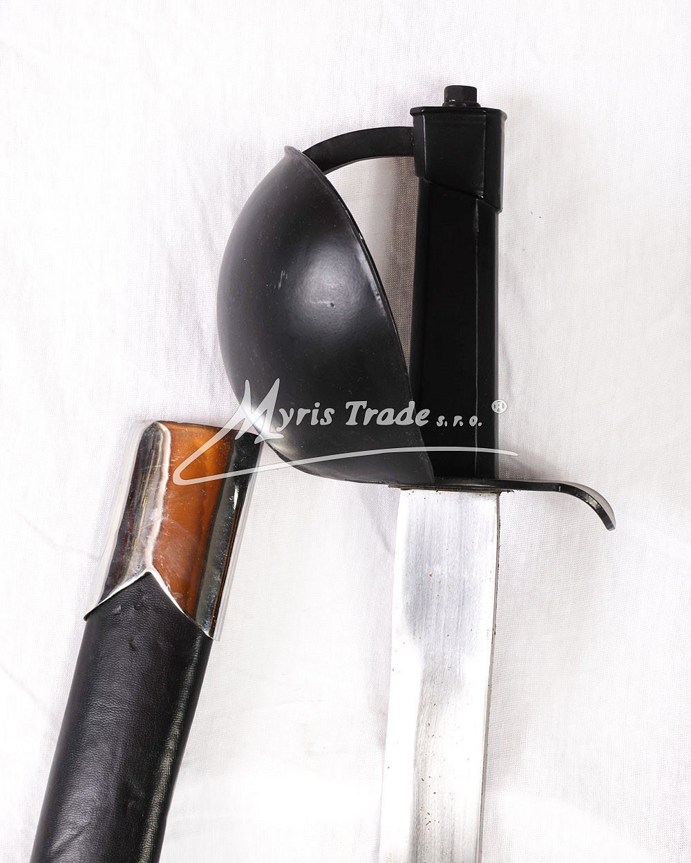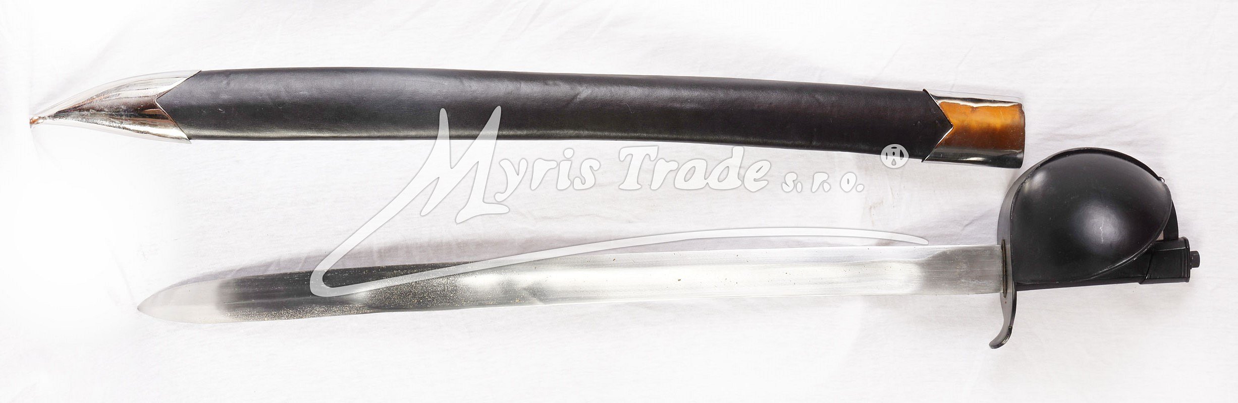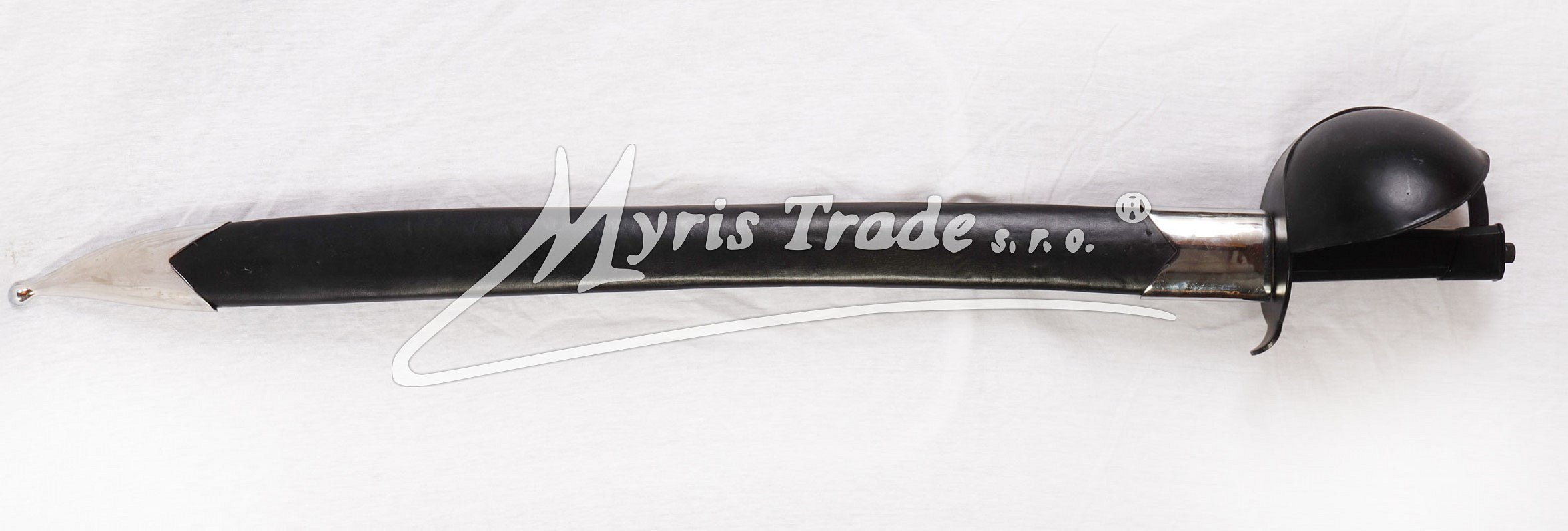 replika historické námořní (palubní) šavle s černou rukojetí v černé kožené pochvě, používané hlavně pro boj na palubě lodí