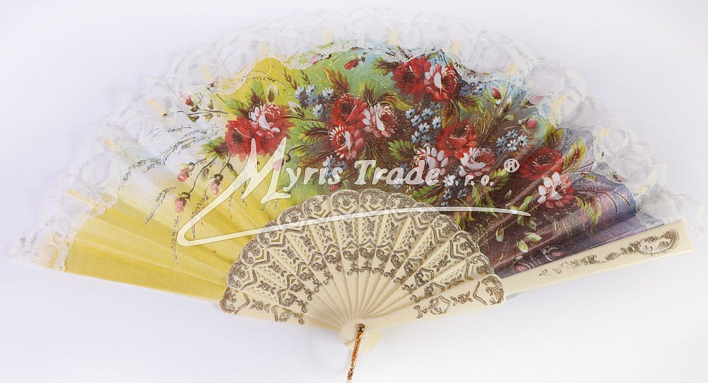 plastový vějíř s květinovým motivem a bílou krajkou lze použít nejen jako krásnou dekoraci, ale je i plně funkční