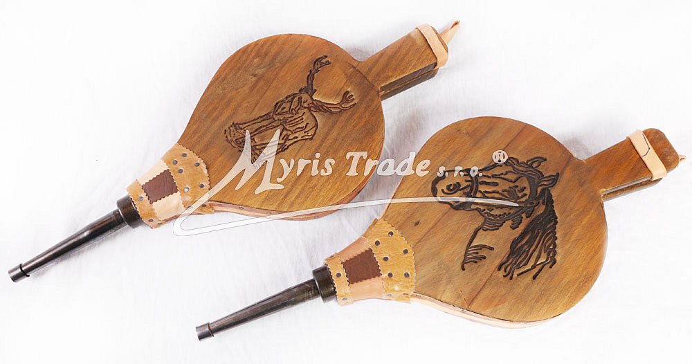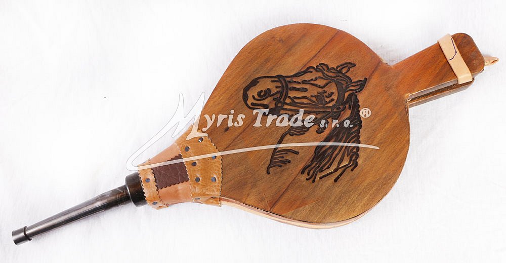 funkční krbové dmychadlo ze dřeva a z pravé kůže,zdobené vypalovaným obrázkem hlavy koně, vhodné pro krby a domácí i venkovní grily