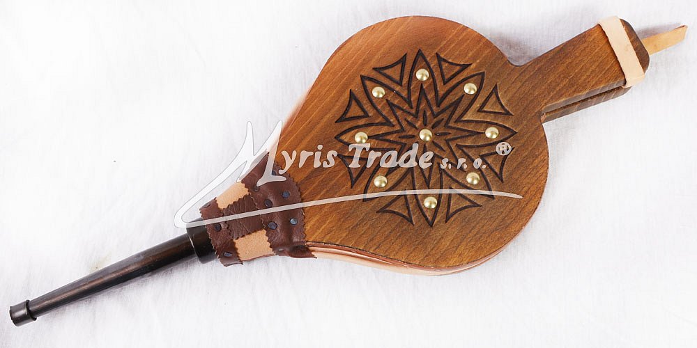 funkční krbové dmychadlo ze dřeva a z pravé kůže; zdobené vypalováním a kovovými cvočky; vhodné pro krby a domácí i venkovní grily