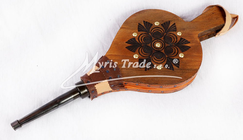 funkční krbové dmychadlo ze dřeva a z pravé kůže; zdobené vypalováním a kovovými cvočky; vhodné pro krby a domácí i venkovní grily