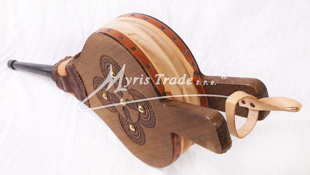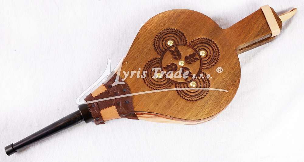 funkční krbové dmychadlo ze dřeva a z pravé kůže; zdobené vypalováním a kovovými cvočky; vhodné pro krby a domácí i venkovní grily