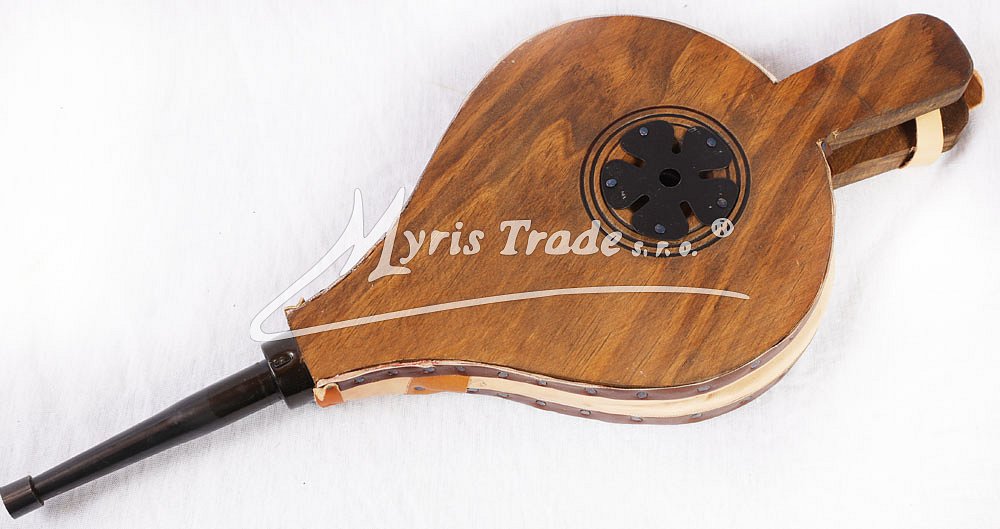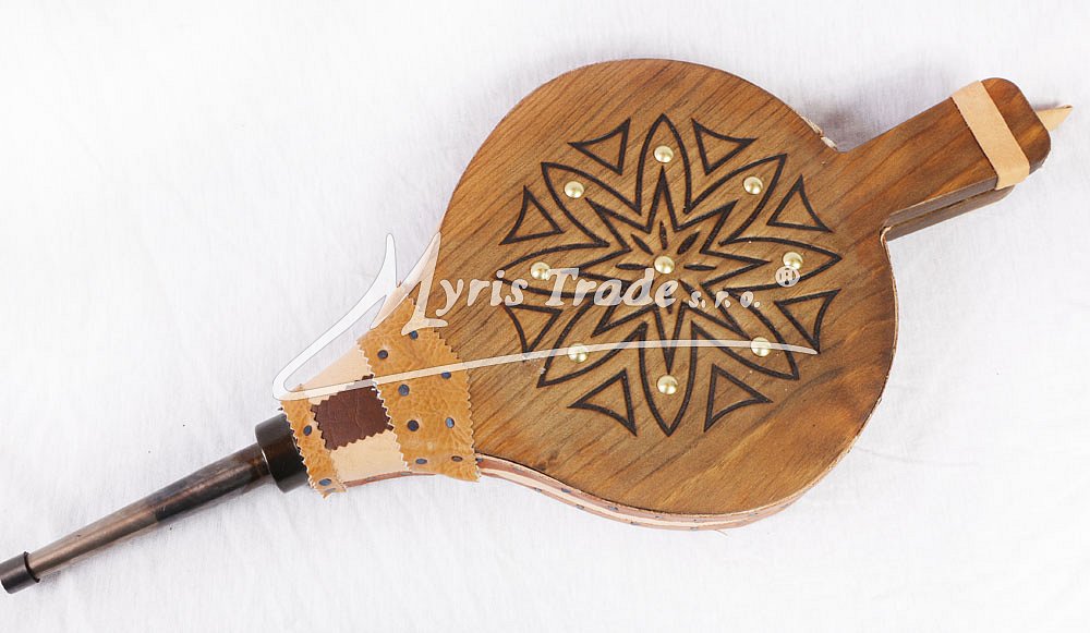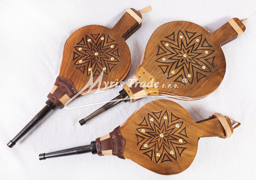 funkční krbové dmychadlo ze dřeva a z pravé kůže; zdobené vypalováním a kovovými cvočky; vhodné pro krby a domácí i venkovní grily