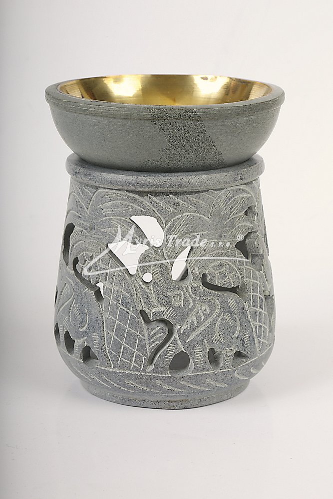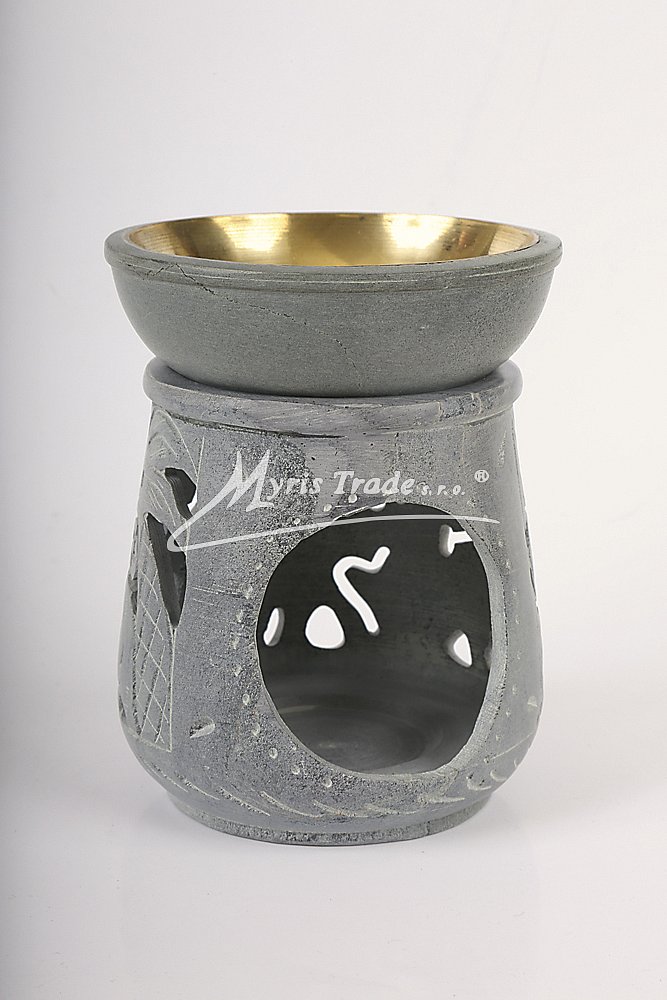 bohatě vyřezávaná aromalampa na čajovou svíčku a aromaolej je ručně vyrobena z mastku, jednoho z nejměkčích kamenů; miska na aromatickou kapalinu je vyložena mosazí, aby se zabránilo případnému prosakování kapaliny kamenem;