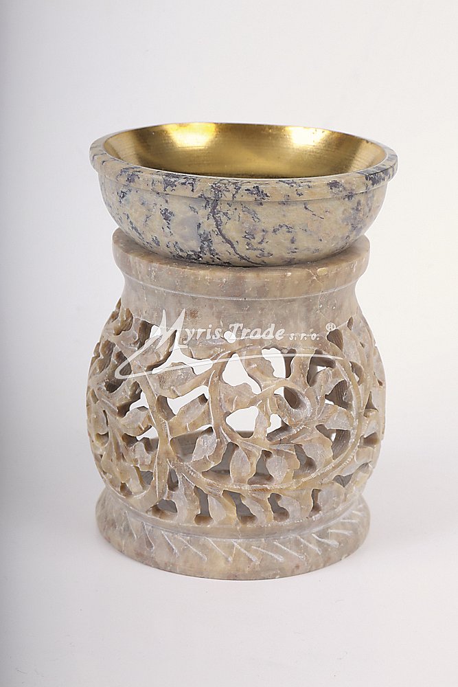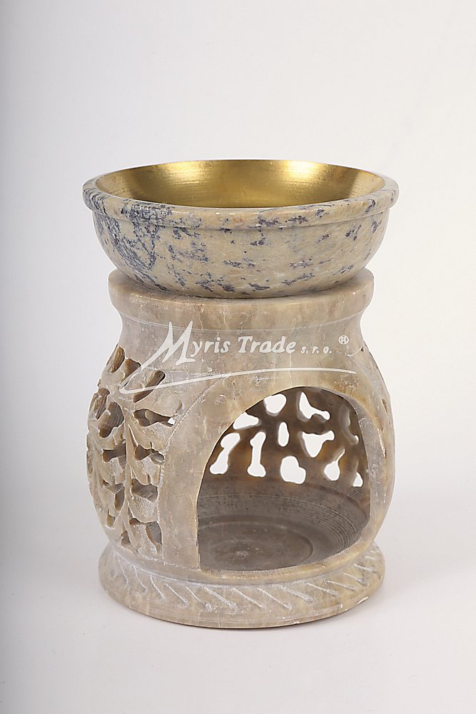 bohatě vyřezávaná aromalampa na čajovou svíčku a aromaolej je ručně vyrobena z mastku, jednoho z nejměkčích kamenů; miska na aromatickou kapalinu je vyložena mosazí, aby se zabránilo případnému prosakování kapaliny kamenem;