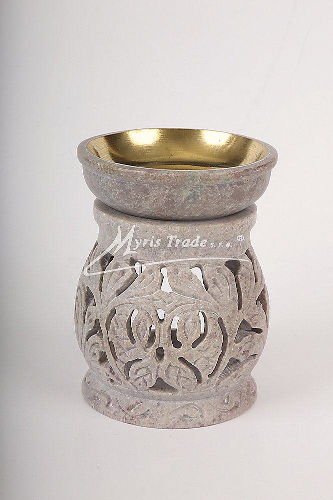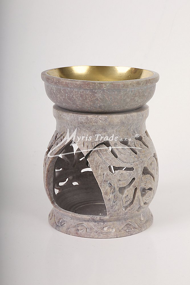 bohatě vyřezávaná aromalampa na čajovou svíčku a aromaolej je ručně vyrobena z mastku, jednoho z nejměkčích kamenů; miska na aromatickou kapalinu je vyložena mosazí, aby se zabránilo případnému prosakování kapaliny kamenem;